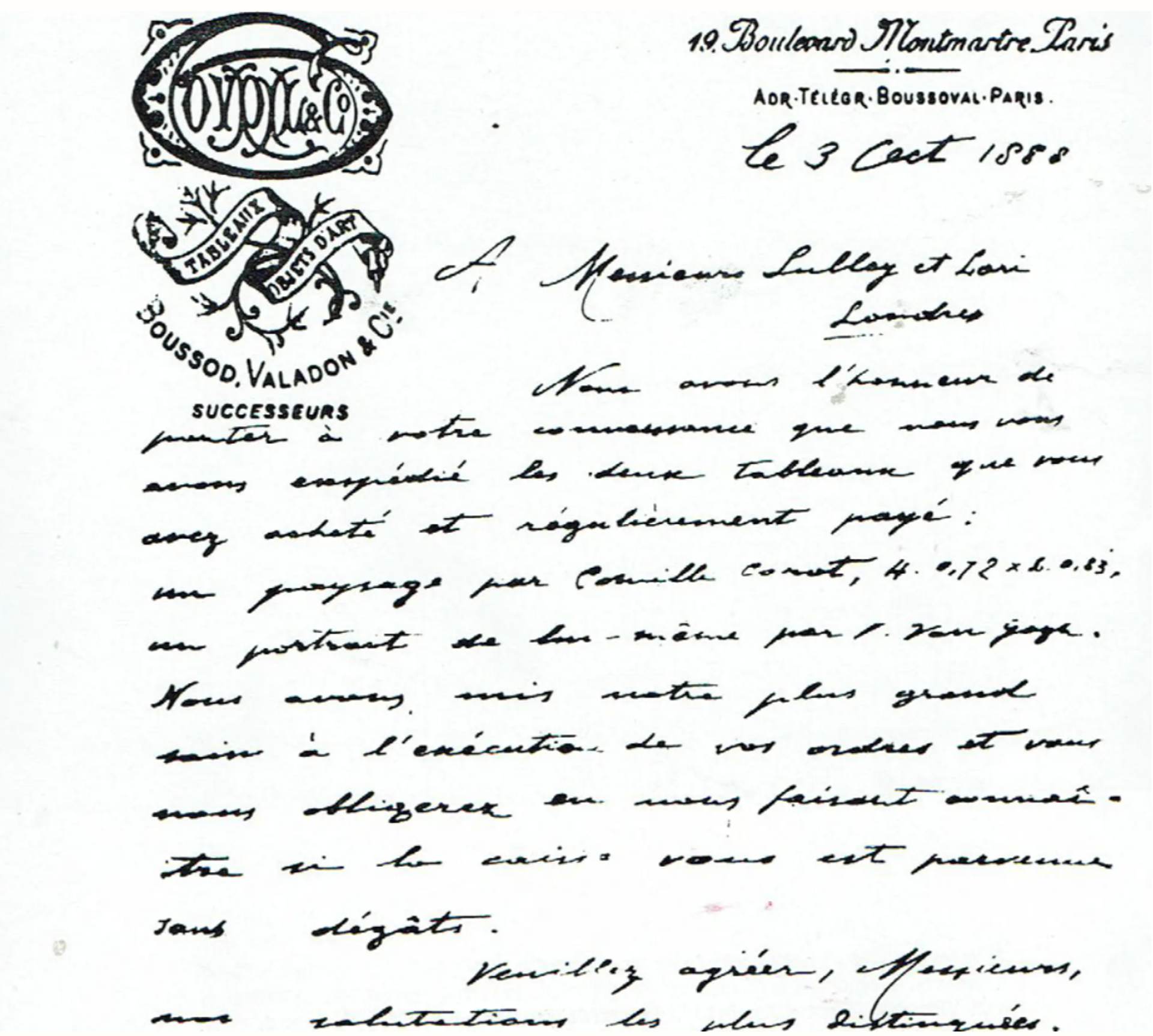Letter from Theo van Gogh to “Messieurs Sulley et Lori [Lawrie]/Londres”, 3 October 1888. © Published in M. Tralbaut, De Gebroeders Van Gogh, Uitgave van het Gemeentebestuur, Zundert, 1964, p.186