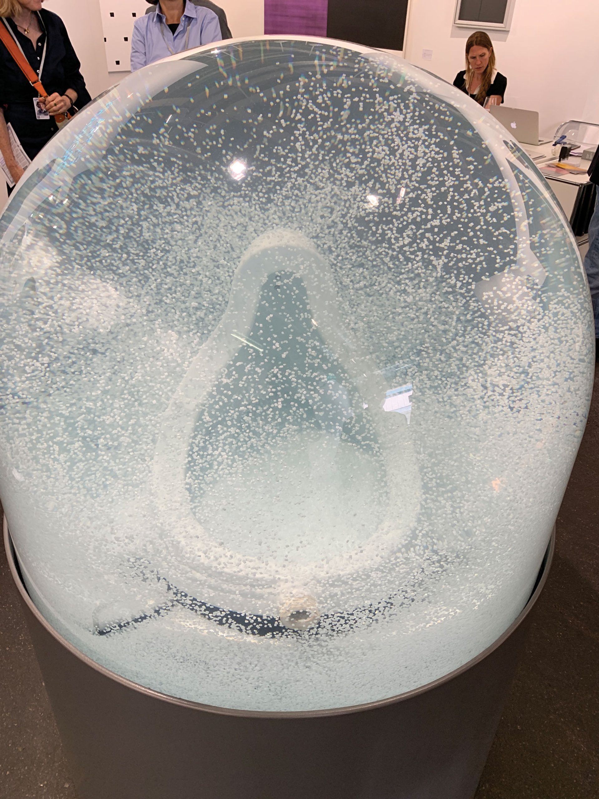 Would arch-conceptualist Marcel Duchamp approve of Bethan Huws’s reimagining of a urinal, on show with Galerie Tschudi? Huws has immersed the object in a huge glass dome filled with polystyrene flakes, bringing to mind Duchamp’s epochal 1917 readymade Fountain. Huws’s 2018 urinal, Reason (or Winter), spins sporadically, causing the flakes to disperse, just like a snow globe. The critic Giorgia von Albertini writes in a gallery booklet: “The first time I saw this astonishing piece, I could not quite decide whether the urinal looked like a white racing car in a winter landscape, or like the holy spirit in person.” Swiss fair visitors also seemed impressed. “Ja, ja, Duchamp would love this,” uttered one in quiet reverence.