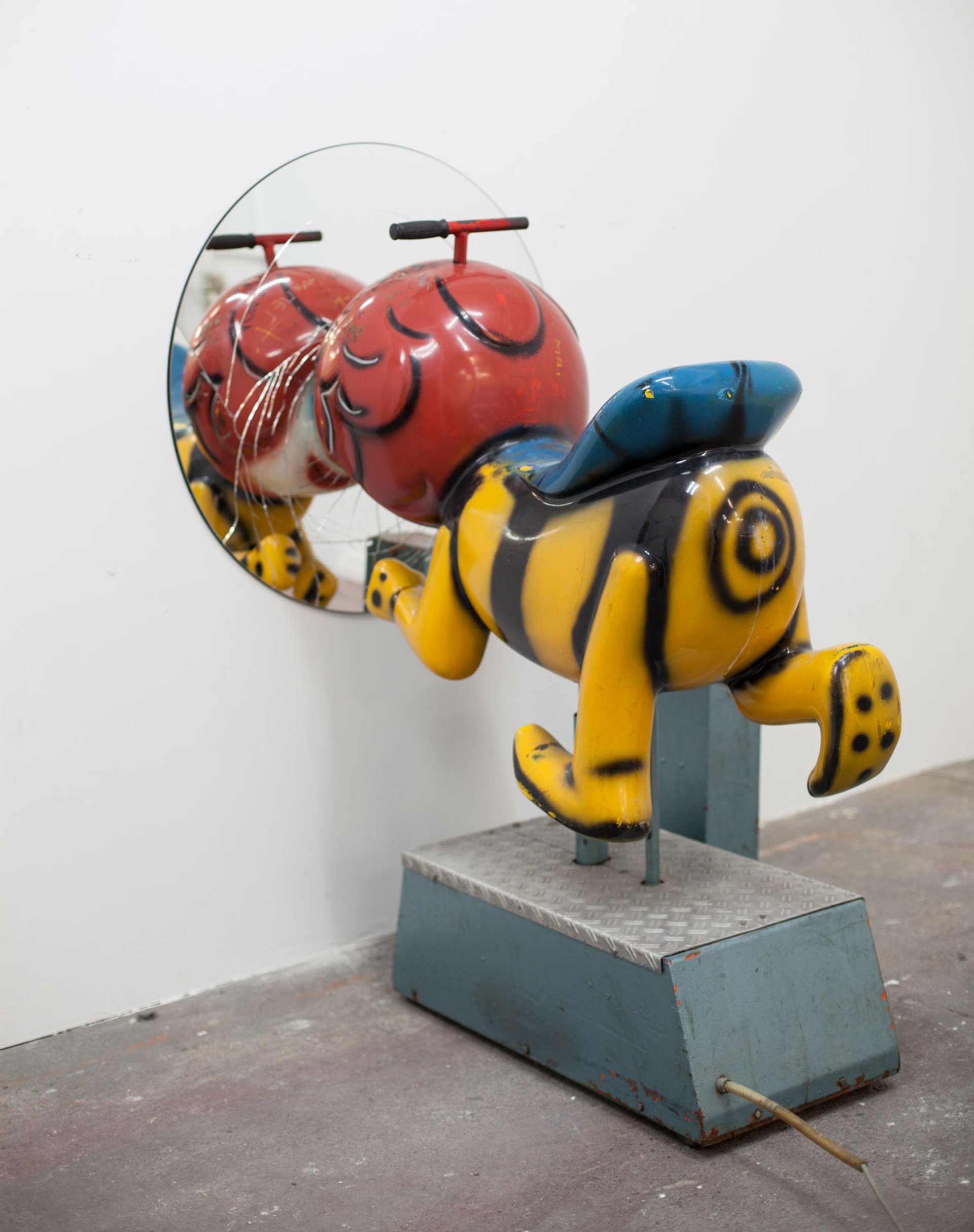 After a week of exhibiting at Art Basel, fair fatigue has probably well and truly set in. Summ summ, bumm bumm (2019), a mechanical kiddie ride in the form of a maniacally grinning bee reversing back and forth into a mirror, by the Berlin-based duo FORT (aka Alberta Niemann and Jenny Kropp) has been attracting an amused crowd on the stand of the Düsseldorf gallery Sies + Höke. The work is about the closeness of play and annihilation, and the gleefulness of self-destruction—which might equally describe the bar of Les Trois Rois hotel past 10pm during Basel week.