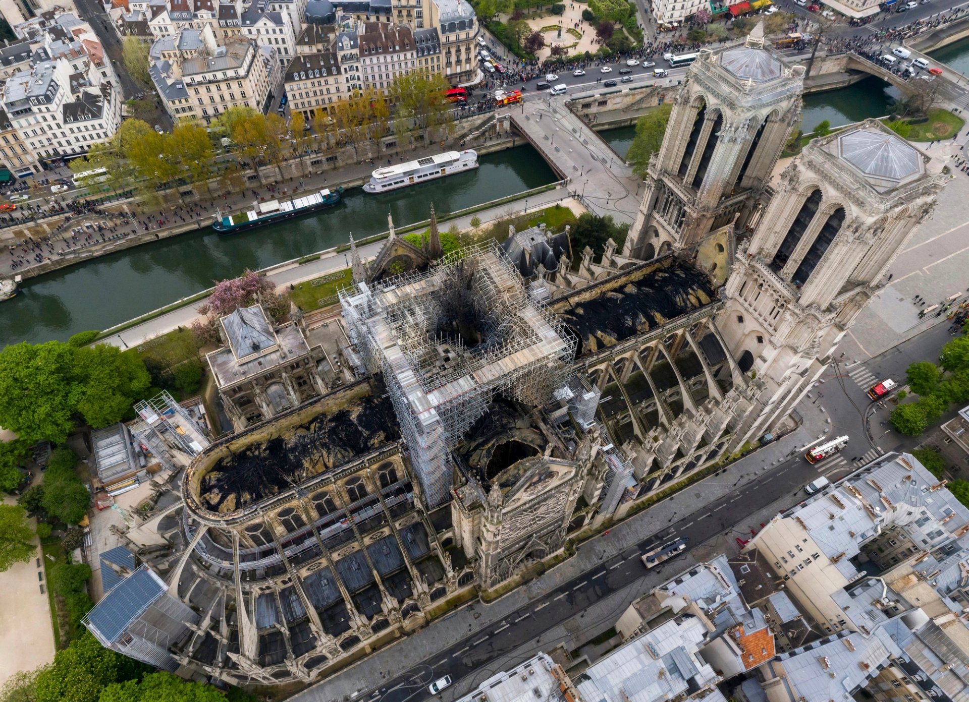 An aerial shot shows the fire damage to Notre Dame cathedral in Paris Gigarama.ru via AP