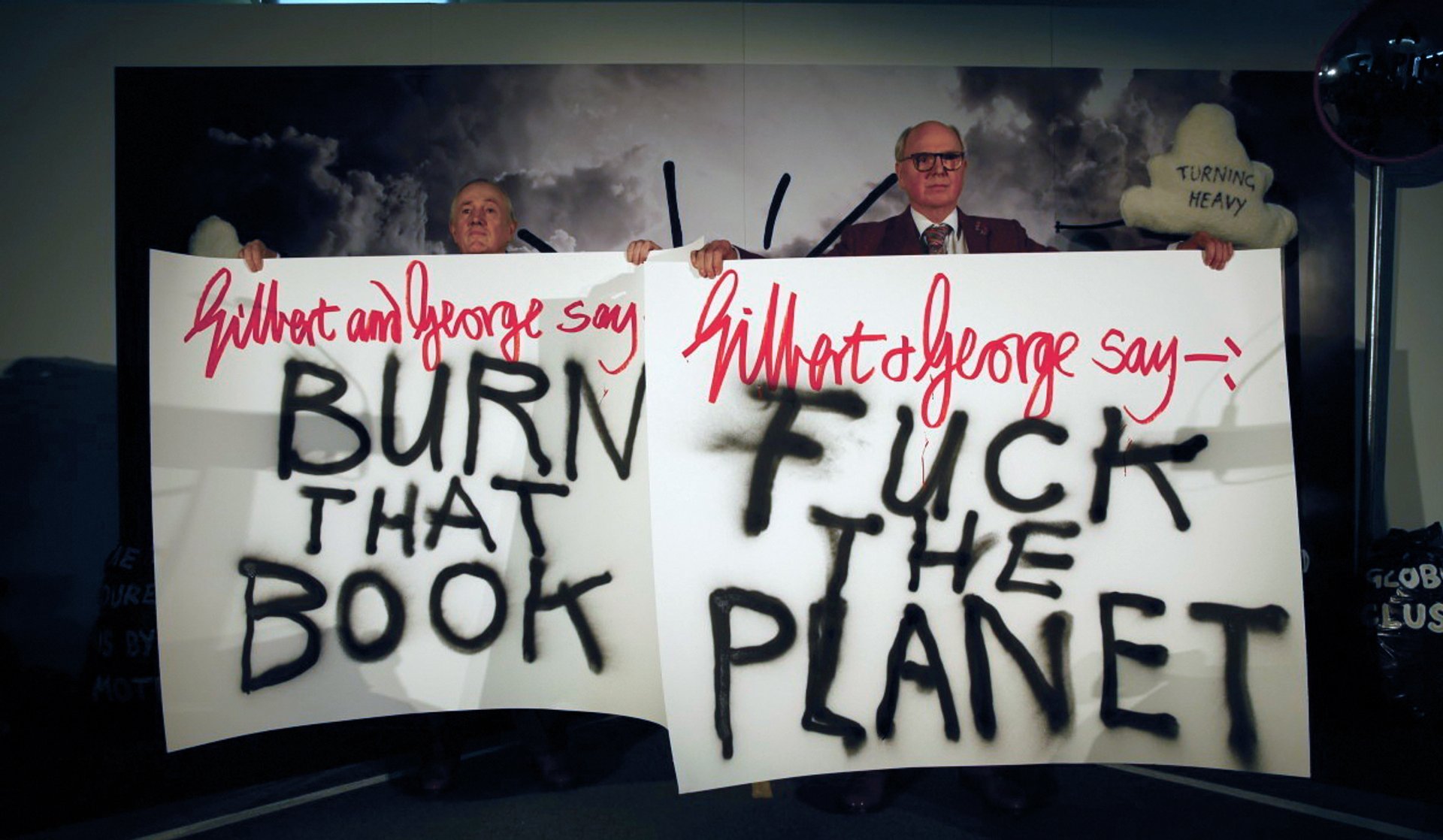 The Banners is another series that began as a performance, and the new body of 30 works is due to be unveiled at White Cube in London next month (25 November-24 January 2016). Two banners (“Fuck the planet” and “Burn that book”) were first unfurled at the Serpentine Marathon last year, during which Gilbert and George silently held them aloft for four minutes.
