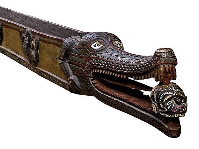 The British Museum’s most spectacular acquisition was the feast trough, which Captain Davis seized from the village of Kalikongu. Nearly 7m long, at one end it is decorated with the head of a crocodile with a carved human head between its jaws.