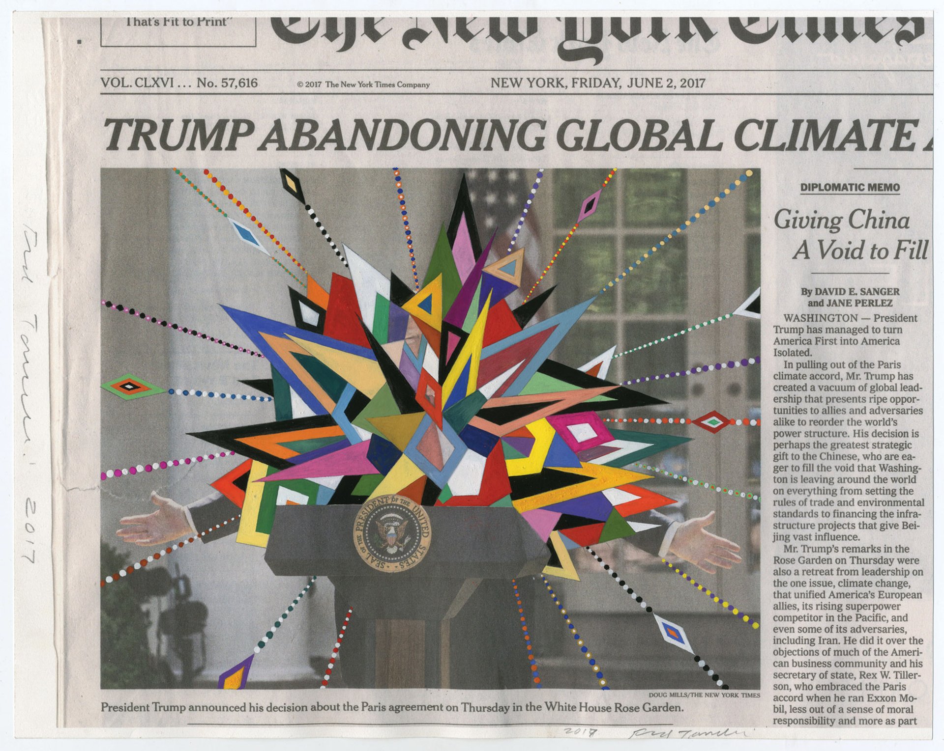 Some say that they have been “paralysed” since Trump took office, finding it hard to work at all. In the past year, Brooklyn-based Fred Tomaselli has “consumed record amounts of news through print, radio, internet, TV, late-night comedy and beyond. It’s a sickness and it’s making me less productive. Trump is the parasite that won’t stop sucking on my brain stem,” he says. Tomaselli first started incorporating pages from the New York Times in his art more than a decade ago, but this source material now has renewed relevance, he says, as the press is “the only institution still holding Trump and his collaborators accountable for their lies”.