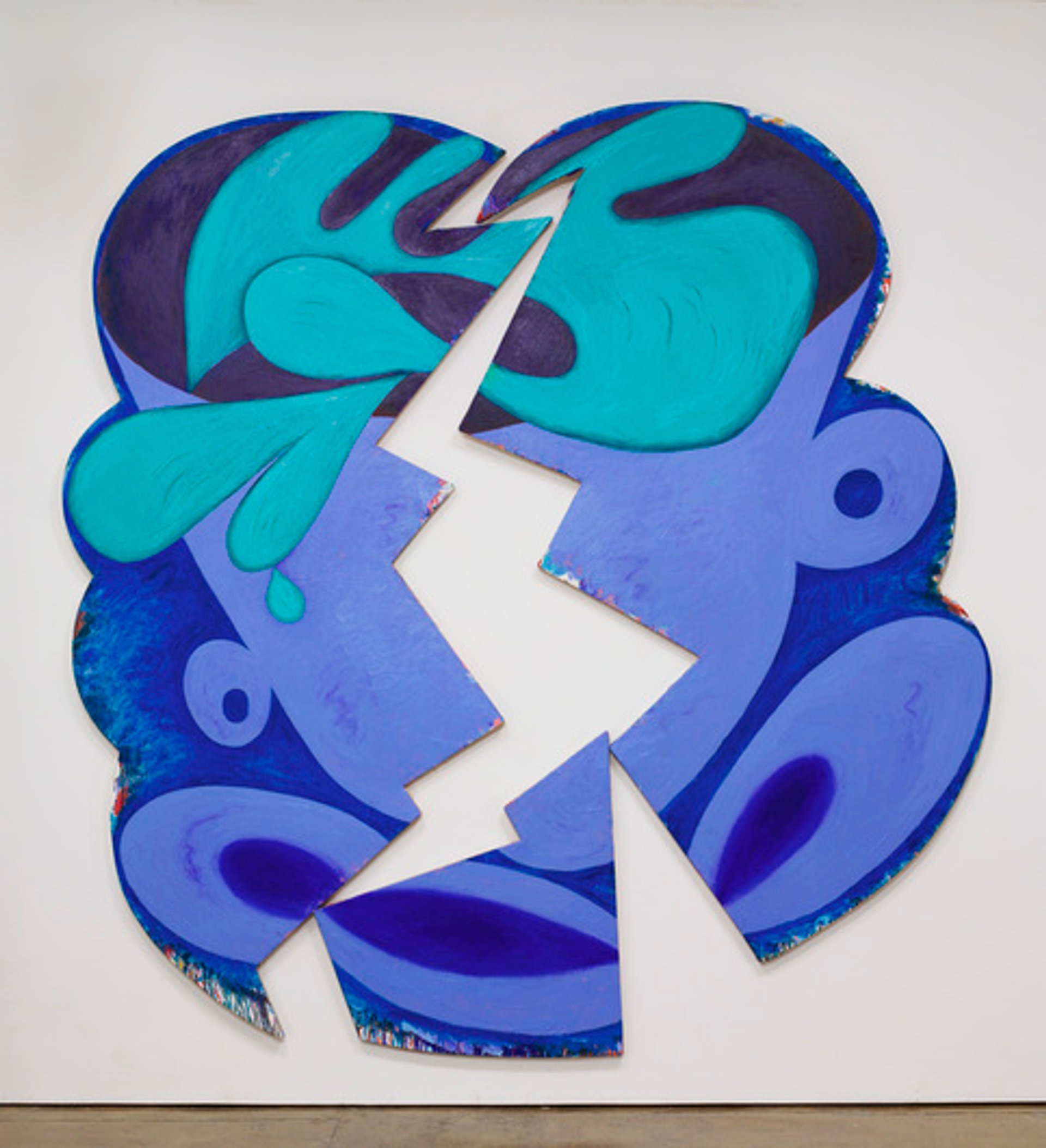 Other works, such as Just in Time, Summer (1981), lent by the Philadelphia Museum of Art, are less harmonious. The work depicts a mug split into two shaped canvases. Another picture, Flying Bye (1982), is of a glass of wine turned upside down, falling towards the floor.
