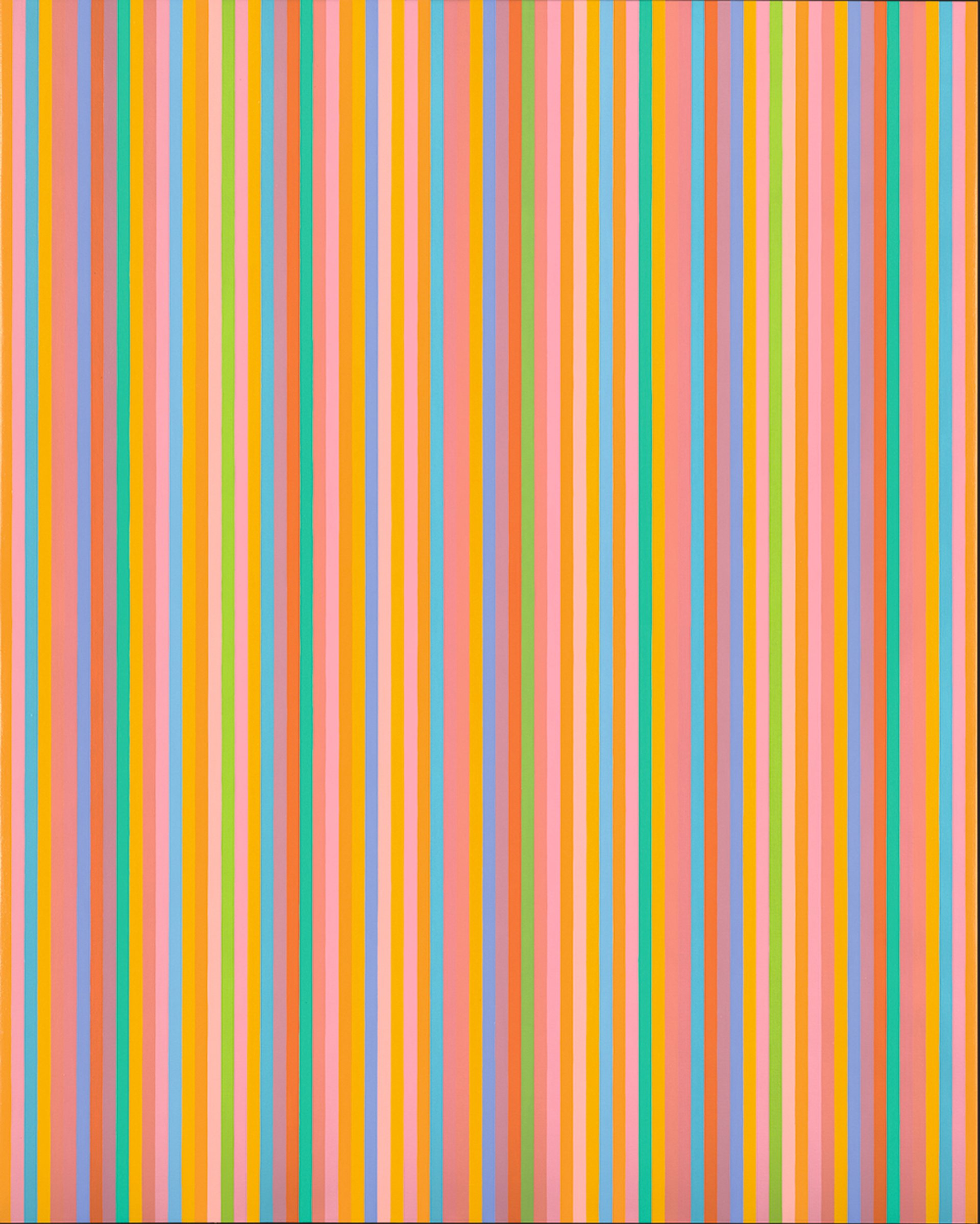Riley’s art engages what escapes the notice of history. I know of no other examples of abstract art that quite match hers in independence from a lineage of developing aesthetic practice, its cultural allegiances, and its strategic swerves. Many late 20th-century artists have made stripe paintings, but none reaches the degree of chromatic intensity and visual surprise that characterises Late Morning 1 (1967), Serenissima (1982) or Aria (2012), all of which generate phantom colours that we perceive along with the colours materially placed on the canvas. Riley’s art induces phenomena as her paint collaborates with light and the physics of nature. The reds, greens, and blues of Late Morning 1 give rise to an aura of yellow that appears, disappears and appears again as the field of the painting vibrates with internal energy. Other works, somewhat more complicated, also involve colours we see yet cannot locate. Along with its predecessor Vapor (1970), Vapor 2 (2009) twists three chromatic grays round each other to form vertical bands, each an amalgam of off-green, off-violet, and off-orange. Riley notes that much of the perceived colour "is not actually painted. It emerges solely through visual fusion." Critics are reduced—or perhaps elevated—to describing her art in simple admiration.