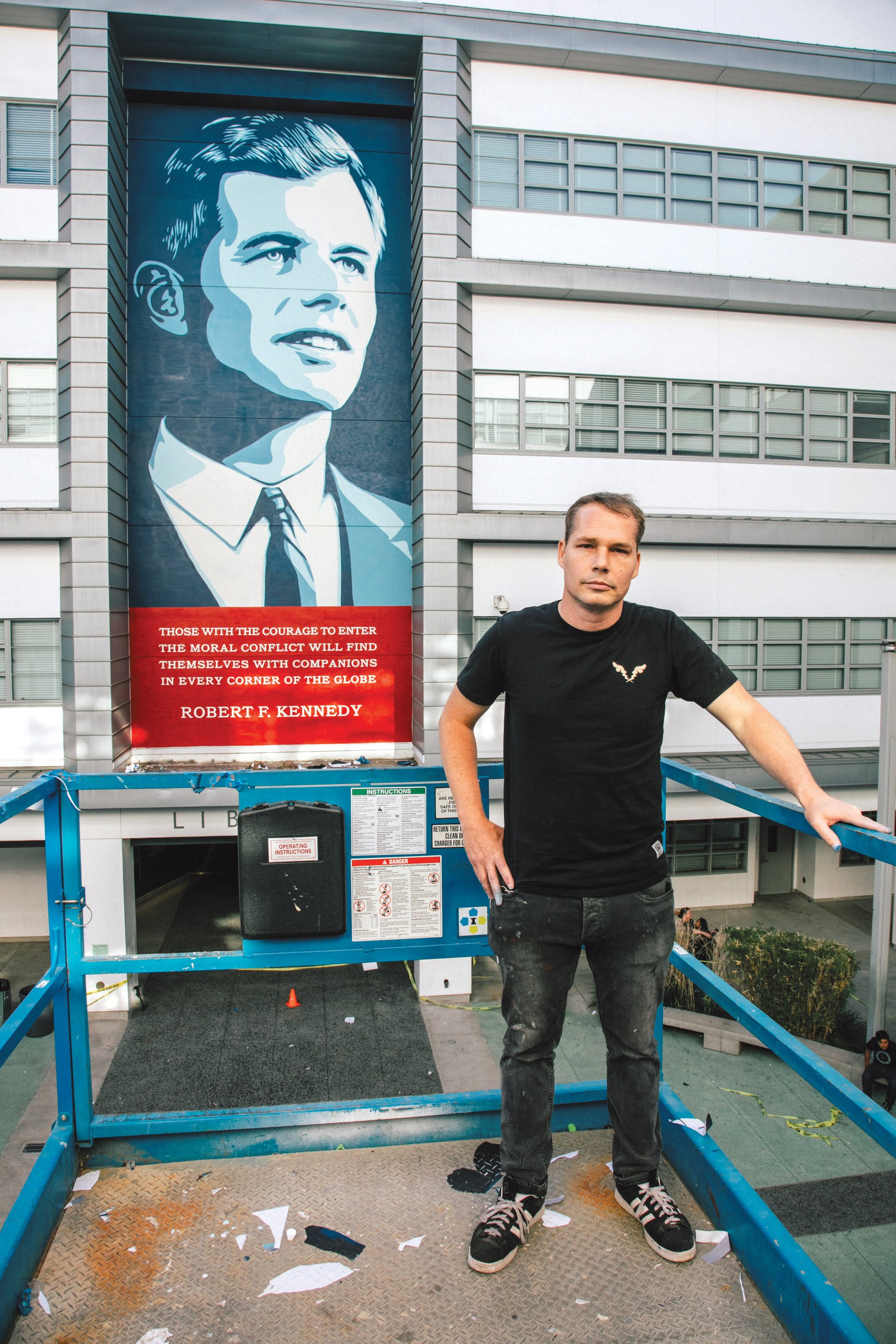 Shepard Fairey in front of his Robert F. Kennedy mural at the Robert F. Kennedy Community Schools complex In Koreatown, LA Photo: courtesy Obey Giant Art / by Jon Furlong