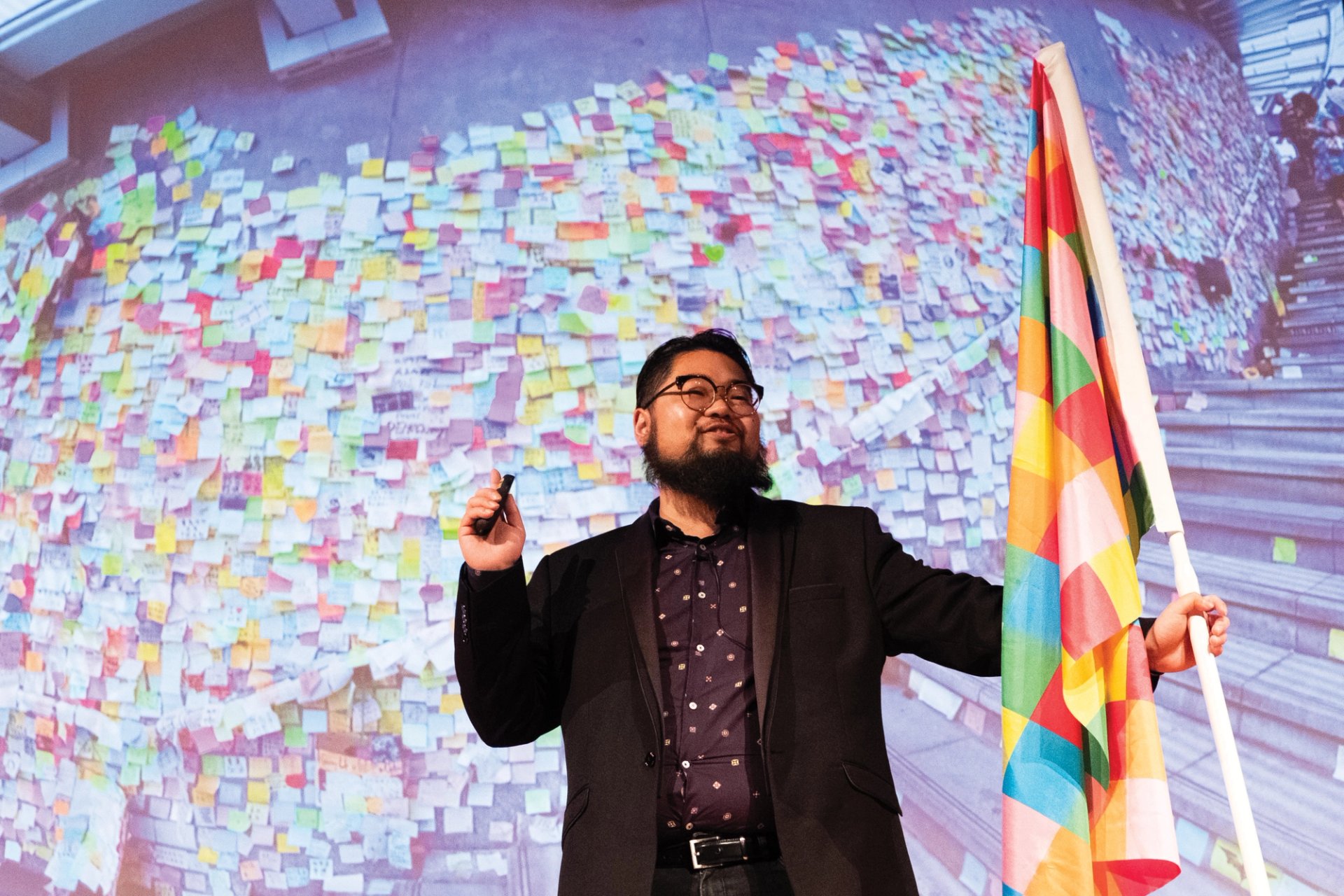 Badiucao holds a flag he created, inspired by the Lennon Wall, during Be Water: Hong Kong vs China in Melbourne Photo © Asanka Ratnayake/Getty Images