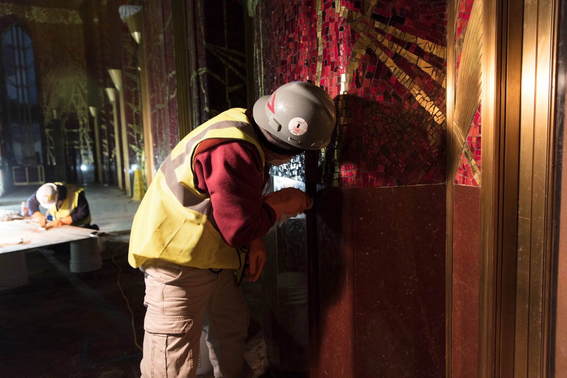 A restoration worker tending to the mosaic at One Wall Street DBOX on behalf of Macklowe Properties