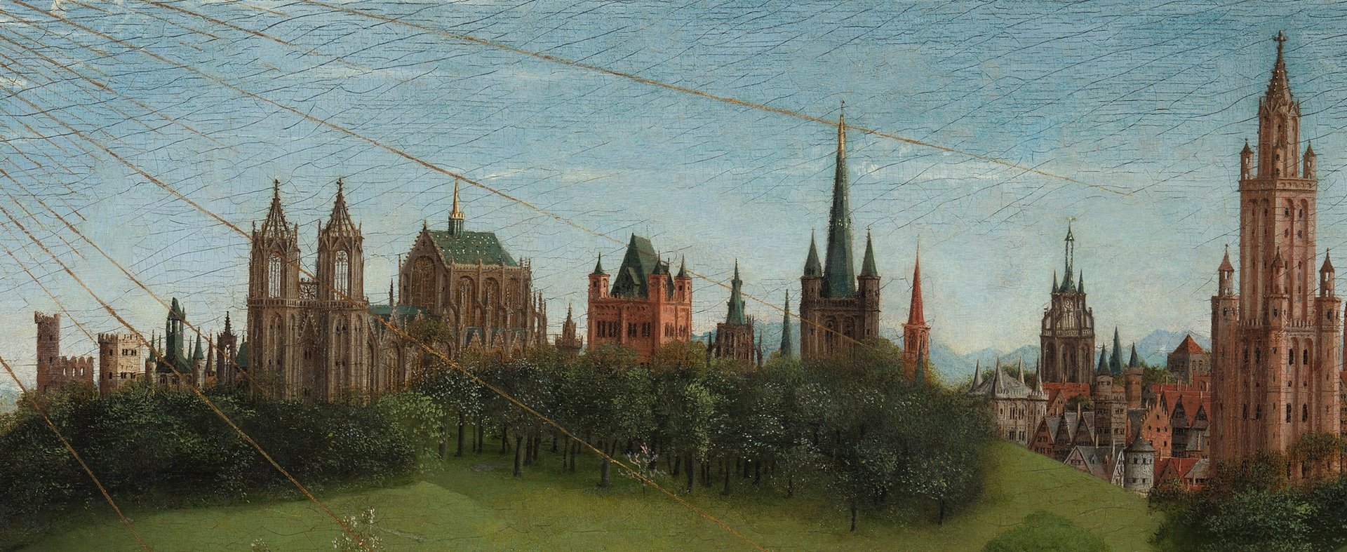 These 16th-century additions had covered around half of the panel featuring the sacrificial lamb, the symbol of Christ. Removing a blue hill on the horizon, for instance, revealed a trio of miniature buildings in the style of Medieval Ghent. The conservators consulted architectural historians on how best to reconstruct partially damaged areas. They also reinstated the crystalline look of the draped robes worn by the pilgrims worshipping the lamb, which had been softened in the overpainting.