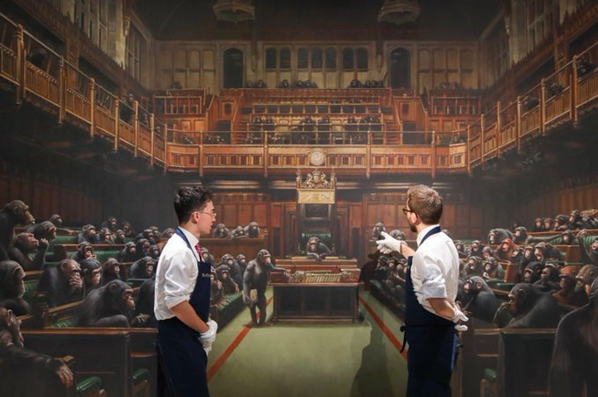A painting by Banksy depicting the UK House of Commons packed with chimpanzees, estimated at £1.5m, is being auctioned at Sotheby's contemporary evening sale in London tonight. Courtesy of Sotheby's