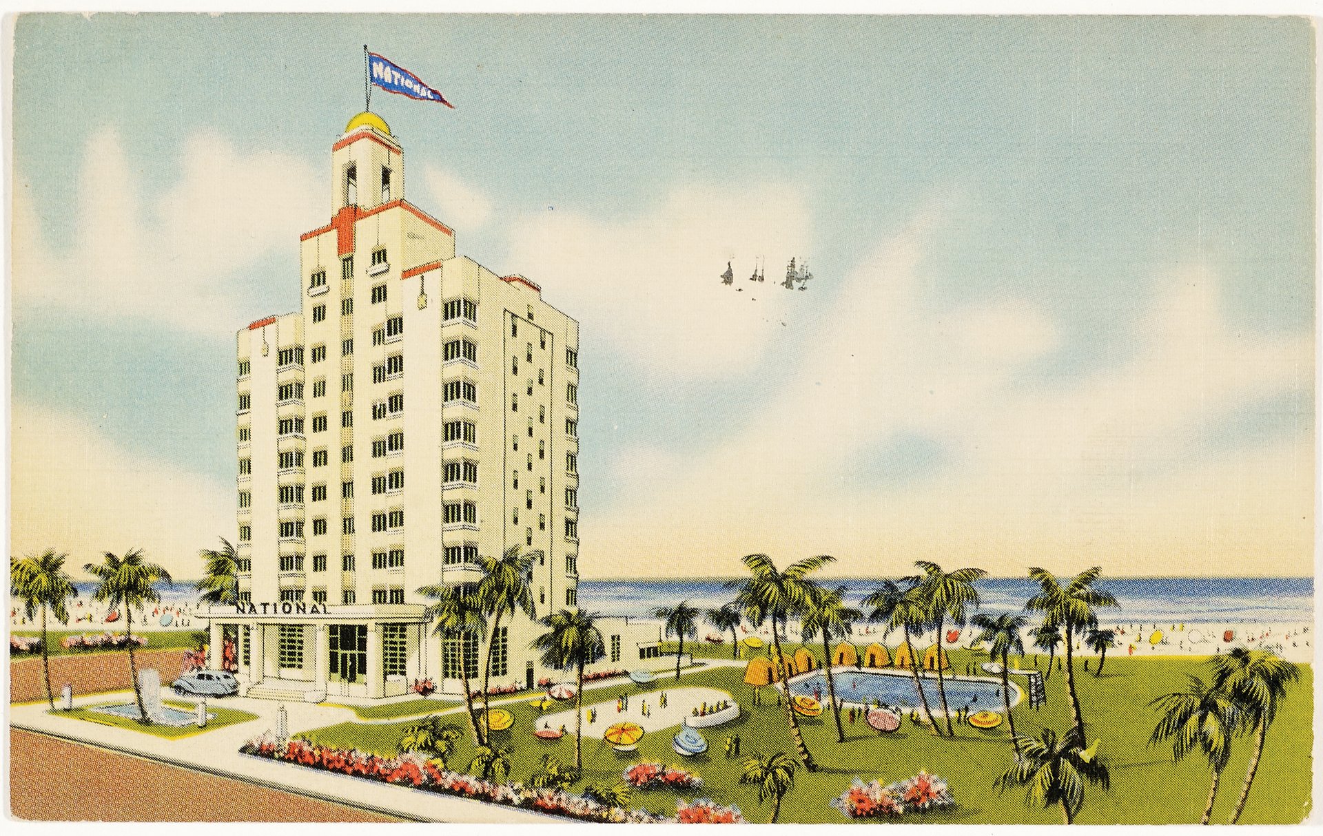 A picture-postcard view of the National Hotel, which boasted a 205ft pool—the longest in Miami Beach. The (then) high-rise luxury hotel was built at the end of the 1930s, a decade in which many low-rise hotels were built in the Art Deco style, aimed at tourists on more modest budgets.