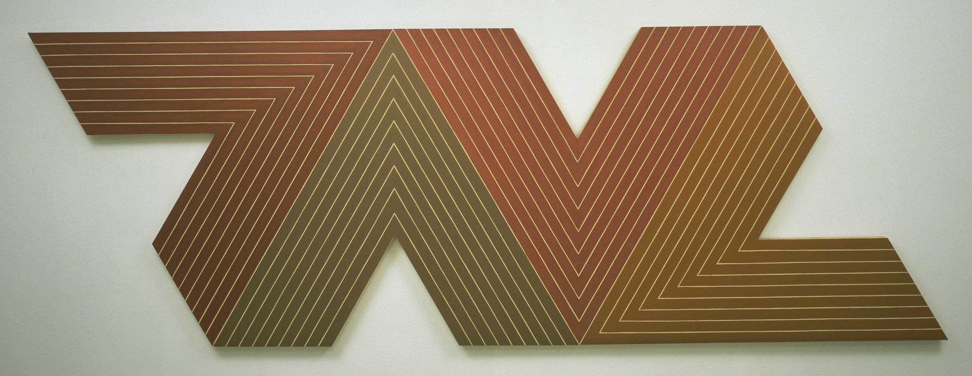 For this, Stella is to blame. For the past 40 years his art has put little pressure on critics, making it easy to pass over without commentary. This was not always the case. His best pictures, from the pre-Black Paintings (1958) until the Irregular Polygon series (1965-66) motivated fierce polemics. “Carl Andre and I were fighting over his soul,” the critic Michael Fried remembered of the 1960s, because with Stella, back then, everything was at stake. His stripe pictures—which include the Black Paintings (1959-60), the Aluminum series (1960) and Copper series (1960-61), the Notched V series (1964-65) and Running V series (1964-65), which are each represented in the exhibition—led either to a new Gilded Age of painting, as Fried demanded, or opened into the expanded field of Minimalism with Andre and Donald Judd.