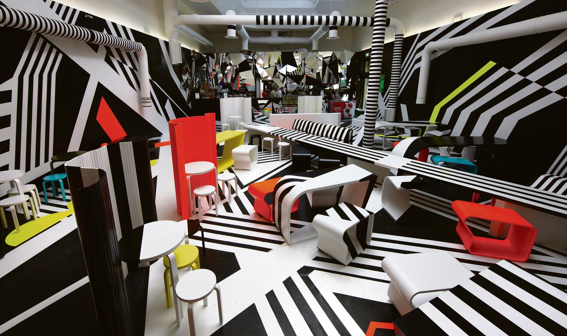 For the 53rd Venice Biennale, organised by Daniel Birnbaum under the title Making Worlds, Rehberger transformed the former Italian pavilion into an eye-popping environment that is also a permanent bar-cafeteria. The disorientating mash-up of geometrically patterned surfaces, mirrors and custom-made furniture (produced in collaboration with the Finnish brand Artek) won him the Golden Lion for best artist. Rehberger drew inspiration from the “dazzle painting” style used to camouflage British battleships during the First World War.
