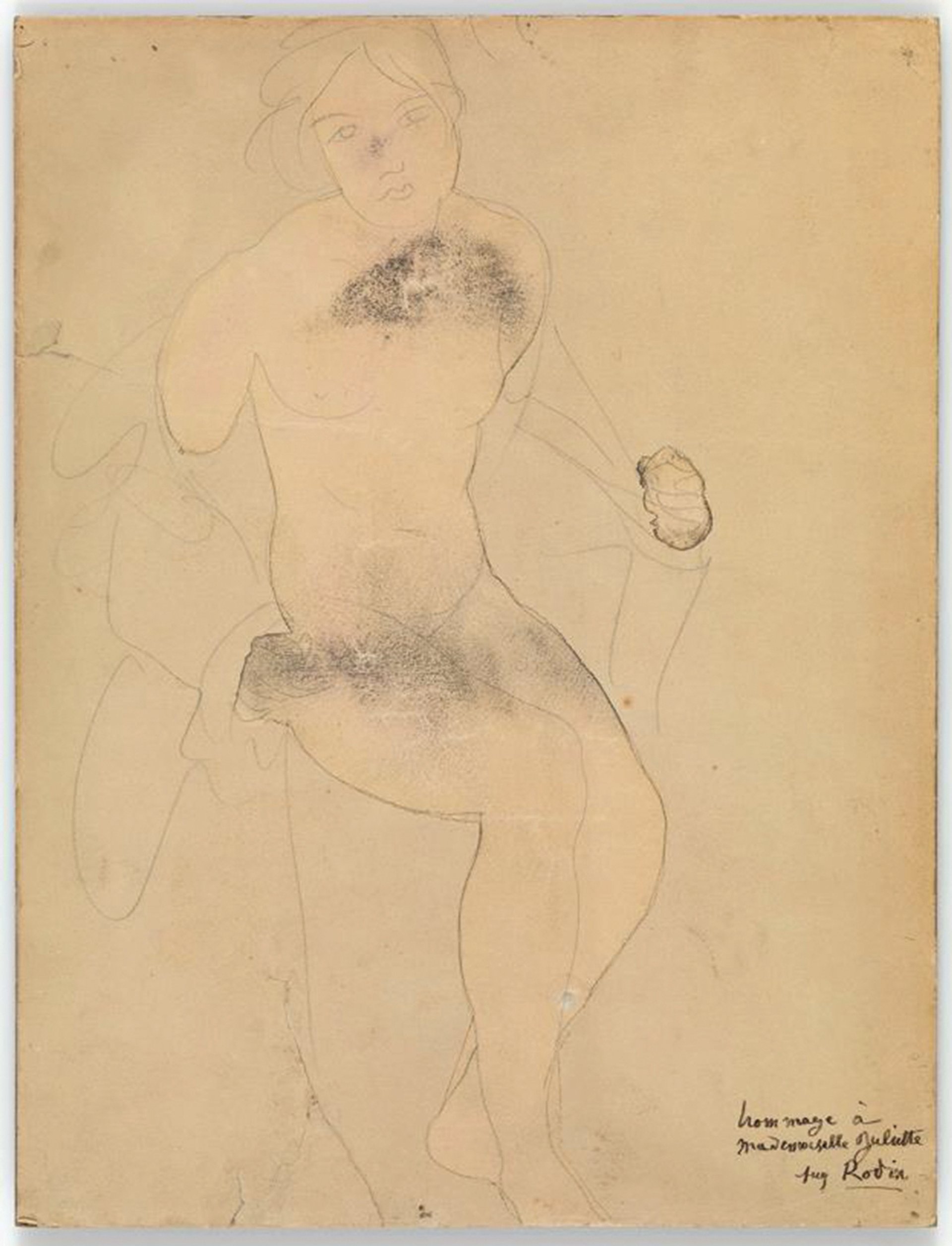 Rodin gave Cooke two of his works. One was a drawing of a young woman opening her dressing gown, inscribed Hommage à Mademoiselle Juliette. The Rodin specialist Christina Buley-Uribe (author of My Divine Sisters, a book on Rodin’s women) dates it to about 1900—in which case it cannot depict Cooke. However, it would have been more likely for Rodin to have given the actress one of the drawings he made of her (the facial features in the one presented to her are not clear enough to identify the sitter). The second gift was a plaster maquette of a relief of a female bust, not based on Cooke. Rodin also gave her his photograph.
