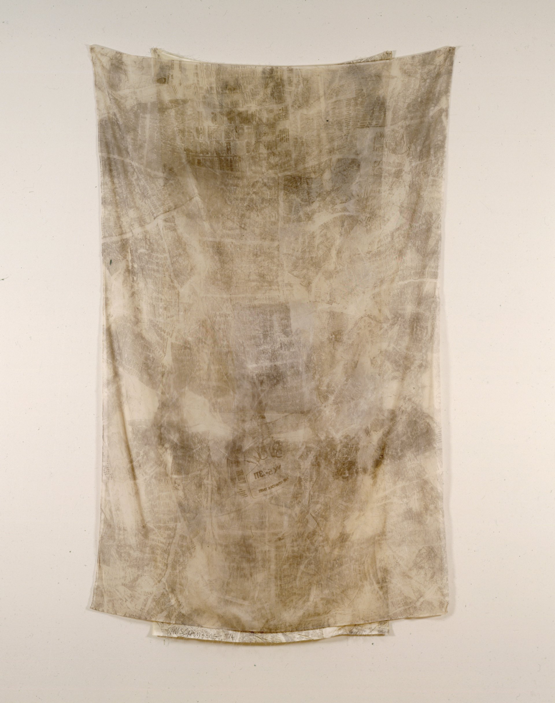 Rauschenberg never shied away from an experiment with new materials. He was inspired to create this series after he noticed faint traces of source images showing up on the cheesecloth used to clean his lithography stones. He aimed to capture a similar ghostly echo by transferring images from newspapers and magazines onto delicate fabric with solvent. With the slightest breeze, the fabric begins to dance. In this example, Rauschenberg goes one step further by tucking a pillow behind the fabric, a reference to one of his most famous combines, Bed (1955). “He kept finding new ways to make a painting,” White says.
