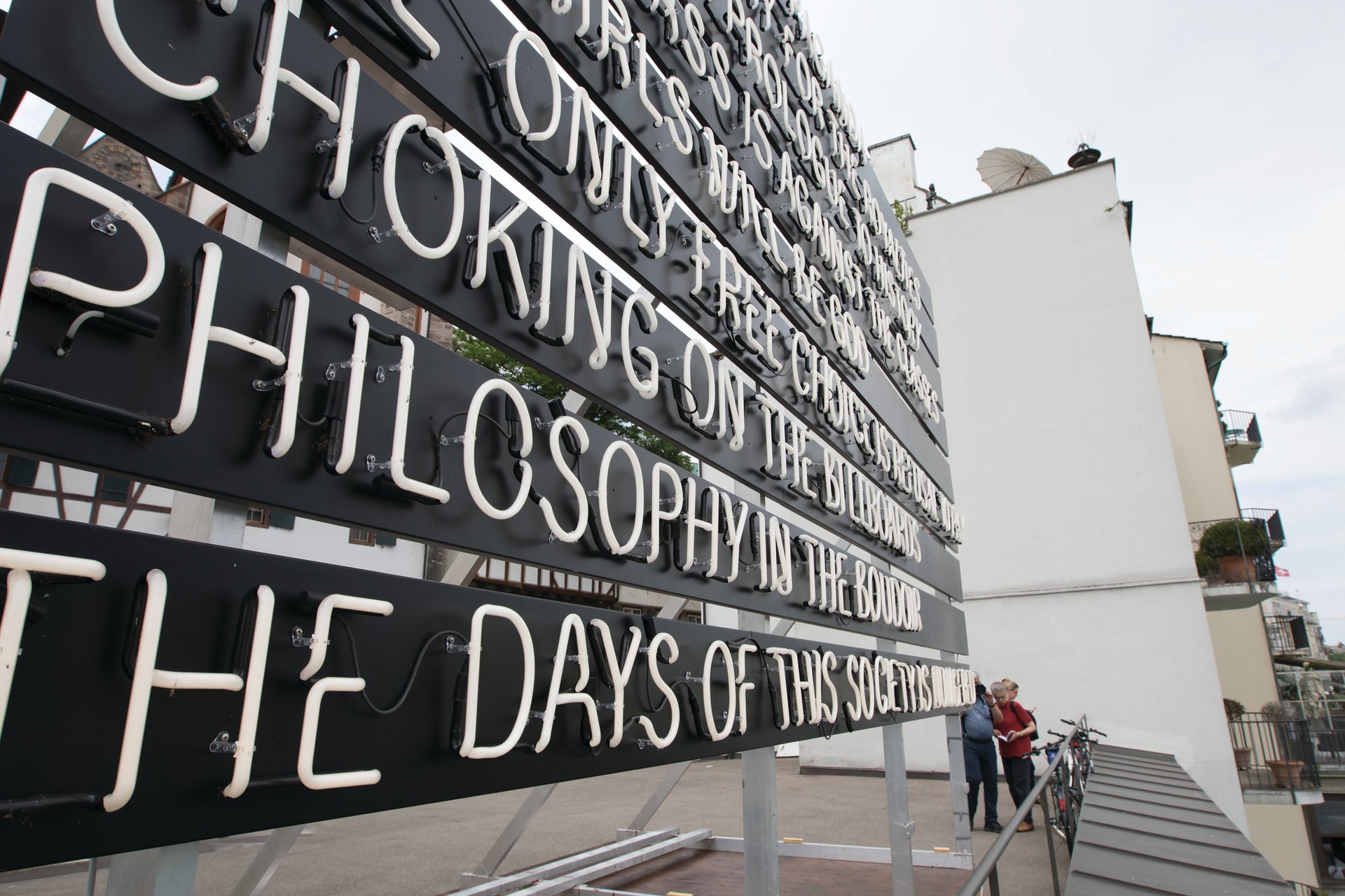 “We’re showing an older piece by Rirkrit Tiravanija on the terrace of the old university. It goes back to his political interest in demonstrations and how signs are used to communicate one’s concerns. The title is a sentence that is displayed on a neon light structure, which shines outwards from the Parcours grounds and over the river. So people driving and walking over the Mittlere Brücke [middle bridge] will see the text, which is an amalgam of phrases from previous generations’ protests against war and from the French Situationist Guy Debord. It’s lit up like an advertising board, so he mixes this support structure with a much more [critical] outlook on where our society’s heading.”