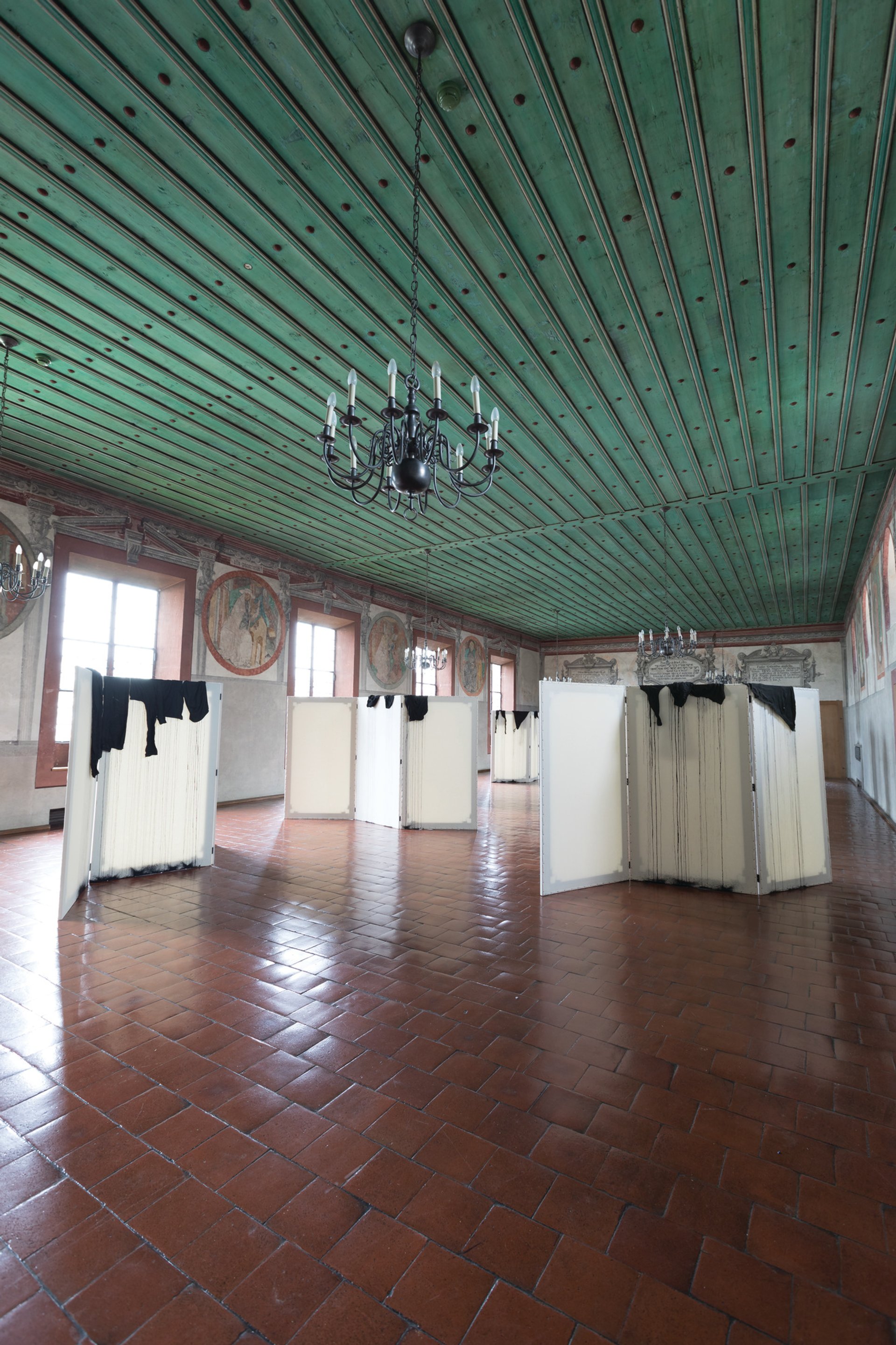 “We were able to secure a beautiful space that has never been seen in Parcours: the Münstersaal. It used to be a council meeting room next to the Münsterkirche and is usually not seen by the public. Latifa Echakhch’s installation consists of nine paravents that are stretched with unprimed canvas. Over these canvases, which are the height of the artist herself, she has thrown her clothing, which she dipped in black ink [that] is dripping down the screens. It becomes a sort of labyrinth, with ghost-like human traces. The church symbolises a place for refuge, for the needy, and one could read into the work the many people who have lost their clothing while migrating from one place to another. The paravents can be partly read as borders.”