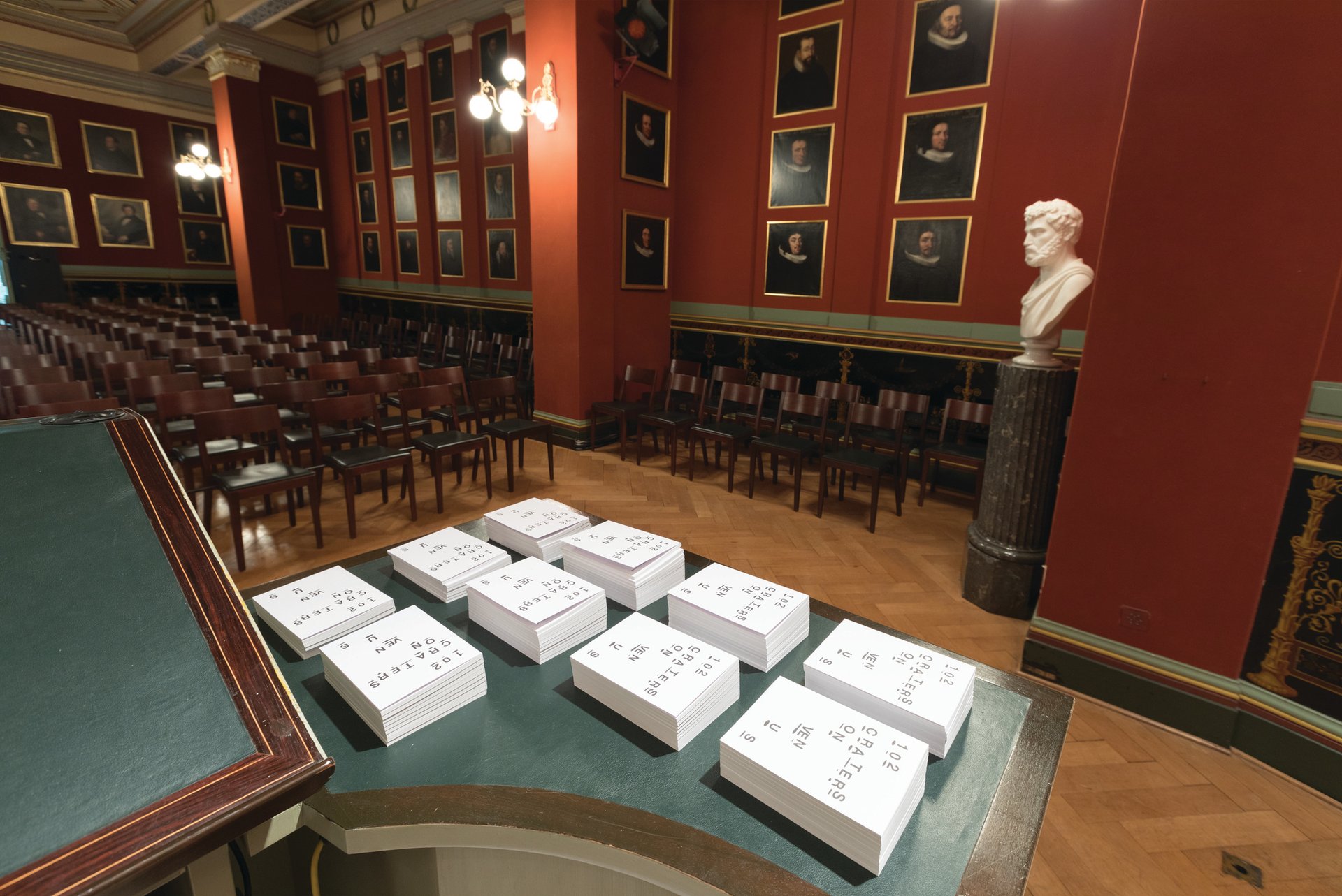 “The Natural History Museum is a protected building and this room is filled with opulent furniture and 102 portraits of male scientists, who founded and taught at the University of Basel. They range from the 1750s to 1860s. The absence of women was so remarkable that Sophie Nys, who does a lot of artist’s publications, made a fanzine about 102 female scientists who all worked at the same time. It’s going to have a spotlight on it and can be picked up and taken away. Every page has a short text about who this scientist was and what she was working on, almost like a listing. There’s minimal design, but a lot of integrity and sensitivity in the way she does it. Sophie Nys is the only artist who has two works in Parcours.”