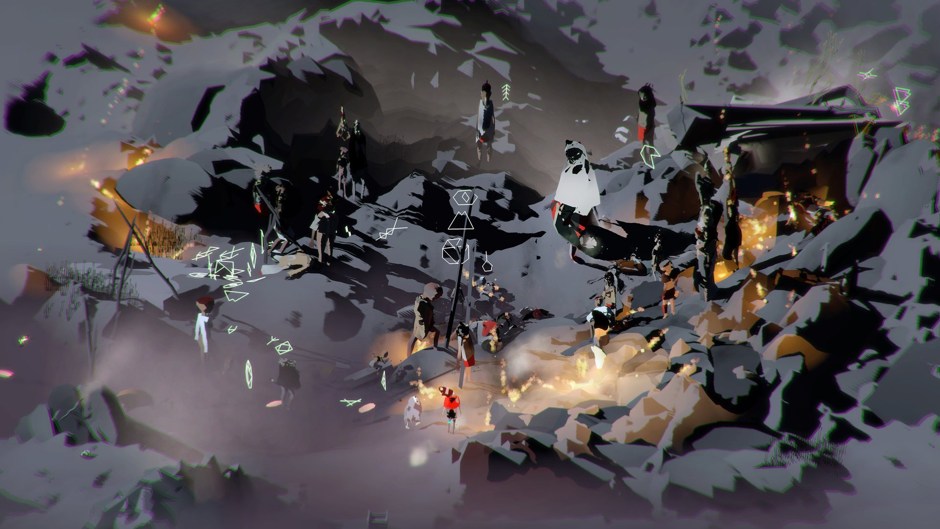 In part one, Emissary In The Squat of the Gods, we see an ancient volcano nurturing a small community on the cusp of civilization. The full story is detailed in wall texts; onscreen the simulation is chaos: explosions in the distance, strange voices blurting out commands. A Shaman and snake-boy gather around a totem known as the Holy Fumerole. Other characters shift about. A young girl is hit in the head by volcanic debris, which shakes her from the spell of the voices that bind the community. With the help of an owl, she breaks away.