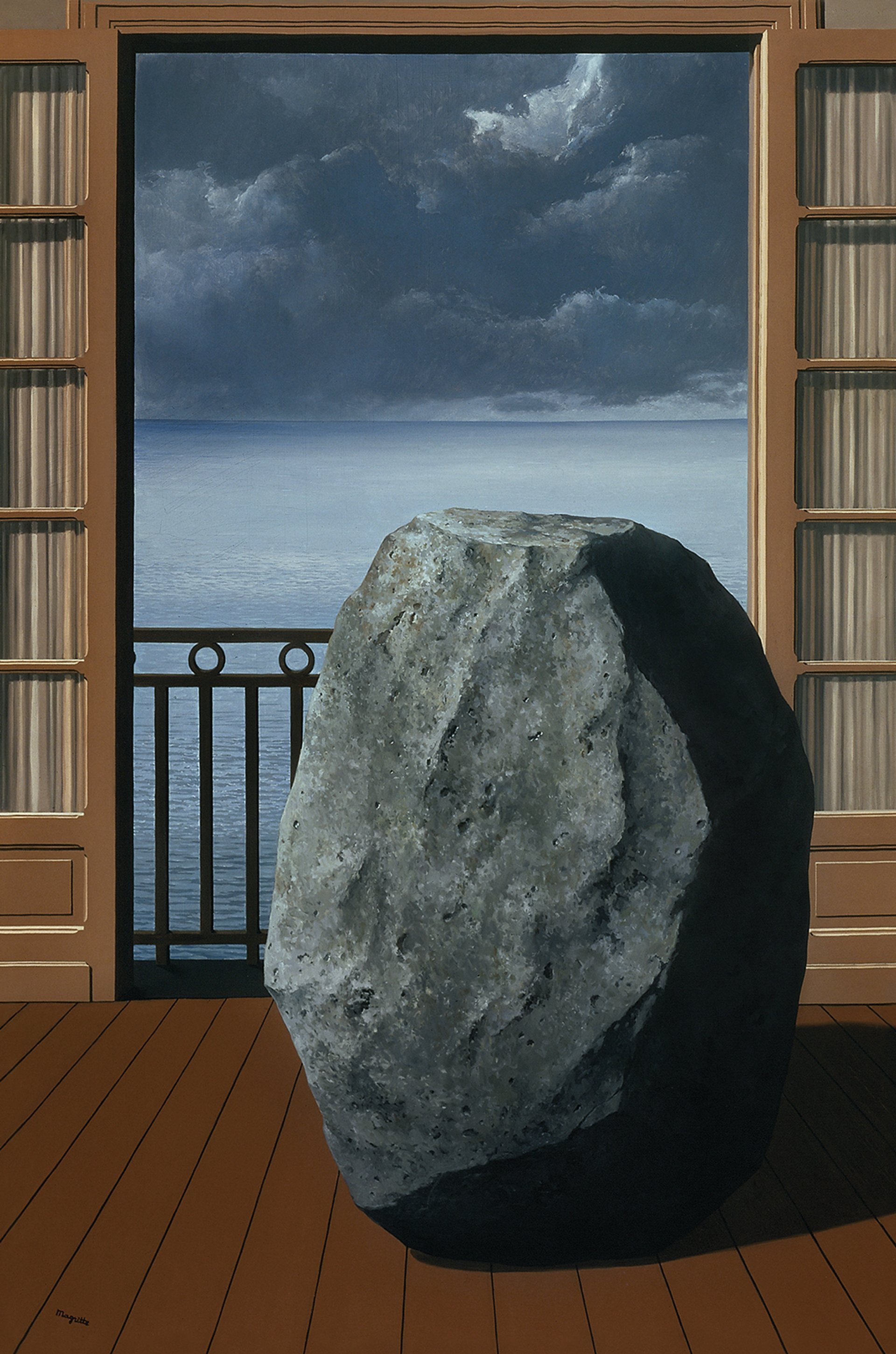 Consider the well-known late painting The Invisible World (1954), from the Menil Collection. It has first-glance plausibility: a boulder sits, crisply shadowed as if by sunlight, on a wooden floor before French doors opened to reveal a shallow balcony overlooking a becalmed sea, beneath a turbulent sky.
