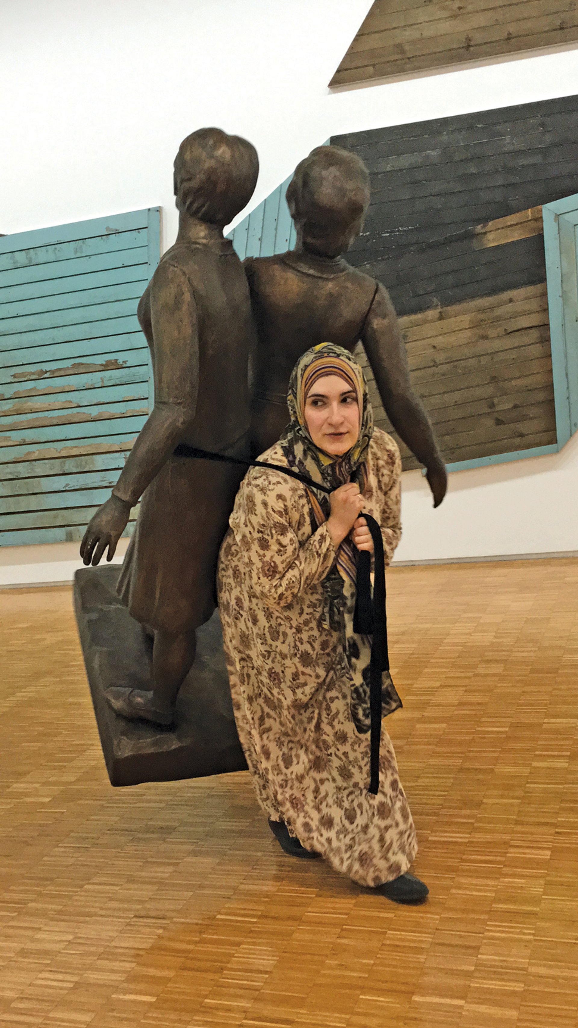 Makhacheva assumes her alter ego Super Taus as she searches for a home for a monument to Maria Korkmasova and Khamisat Abdulaeva, the two Dagestani museum attendants who saved a Rodchenko canvas by seizing it from a knife-wielding robber in the early 1990s. Makhacheva developed Super Taus “in recognition and homage to all my female relatives who perform heroic tasks in their daily lives”, she says. Dressed in the cheapest daily wear of women living in northern Dagestan, Super Taus has extraordinary strength, walking between the Dagestan capital Makhachkala, Moscow and Paris with the 300kg sculpture on her back. “Super Taus is a work in progress; right now she’s thinking about creating a superhero coalition,” says her creator.