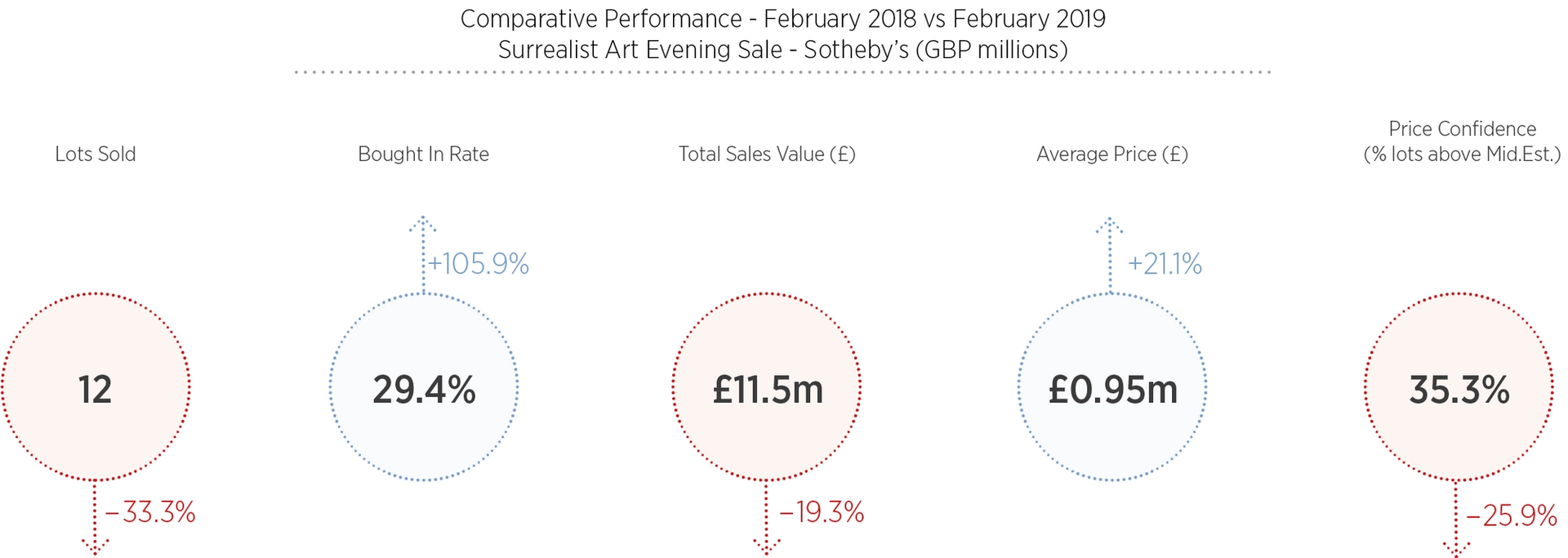 Comparison of Sotheby's evening Surrealist art sales in February 2018 and 2019 Courtesy of ArtTactic