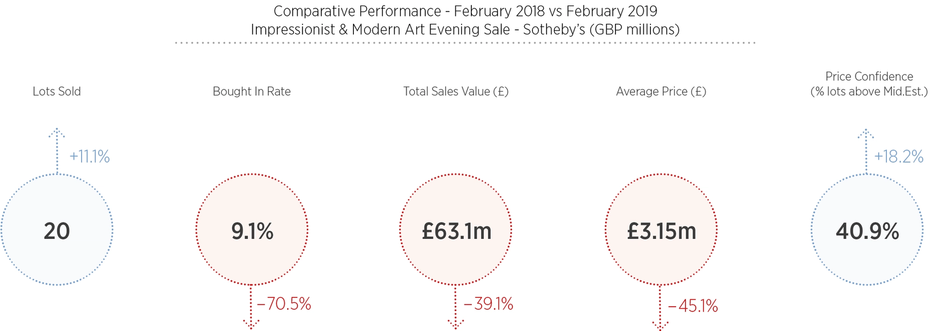 Arttactic's breakdown of Sotheby's February Impressionist and Modern art evening auctions in 2018 and 2019 shows at 39% drop in total sales Courtesy of ArtTactic