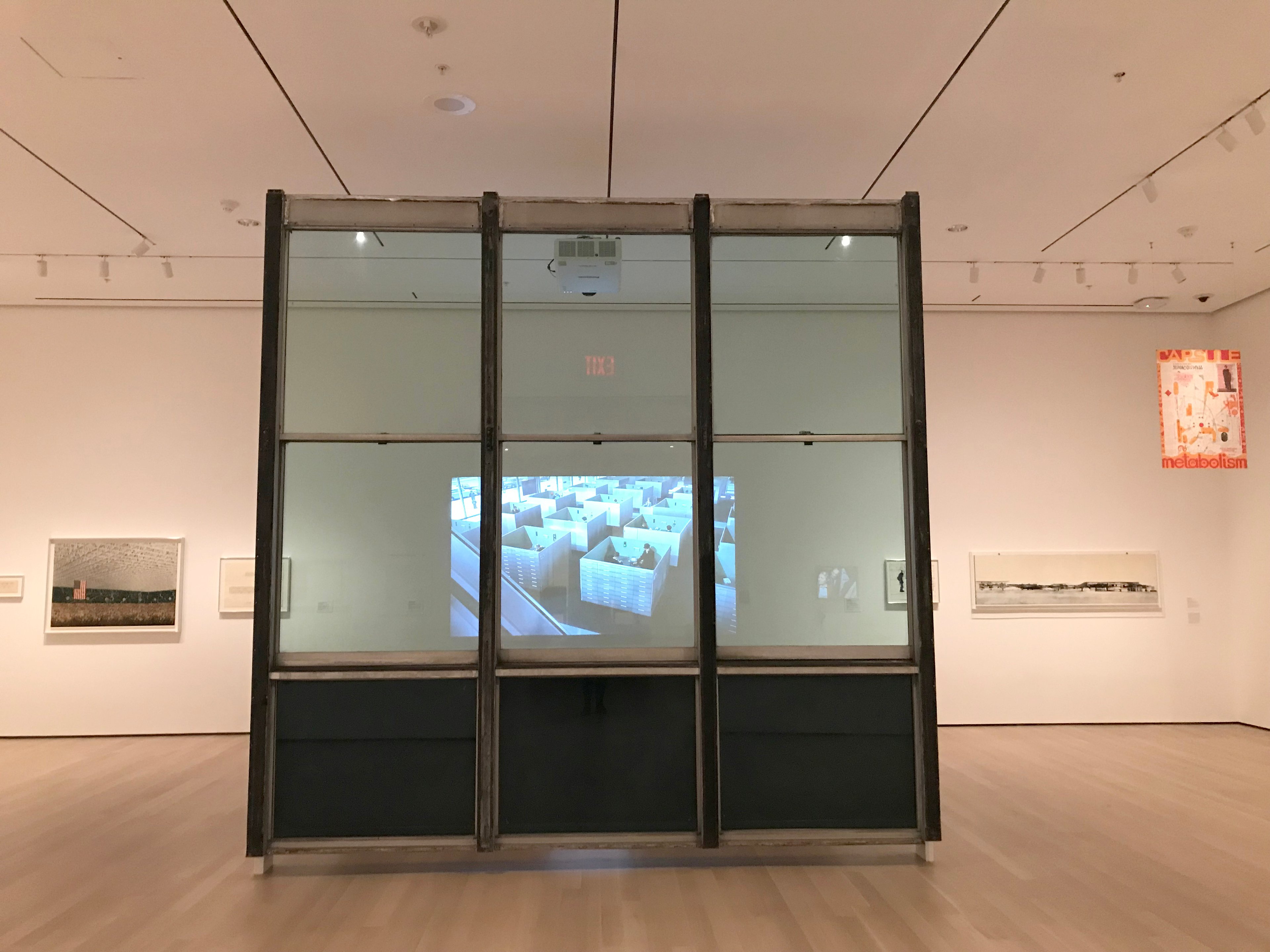 In a fourth-floor gallery exploring Architecture Systems, the portion of the façade from the United Nations Secretariat Building in New York frames a frenetic film by Jacques Tati, Playtime (1967) © Photo: Helen Stoilas, The Art Newspaper