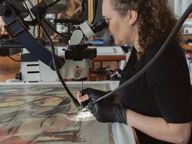 Hartman’s techniques include thread-by-thread tear-mending promoted by the late German conservator Winfried Heiber. “I love the philosophy of it”, working “on a more focused local perspective instead of treating the whole painting”, she says. This method involves reweaving the canvas under a microscope and retensioning the area so that it looks seamless on the front of the painting. The technique uses small amounts of adhesive and precise tools—including DIY examples that conservators devise for themselves, such as micro-tweezers that can be filed down.