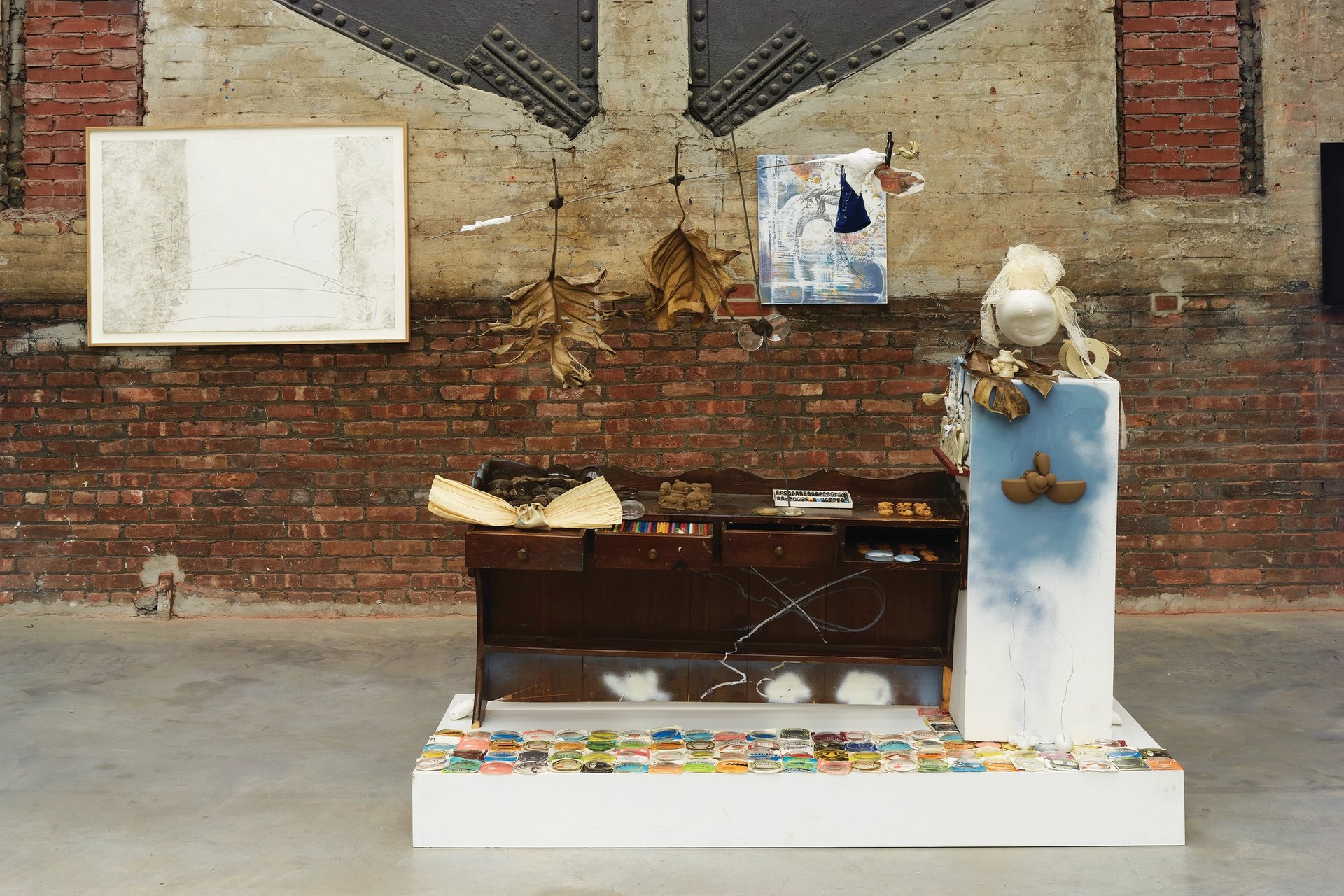 Aran’s mixed-media paintings are abstractions of their making—beautiful and so densely layered they take time to discern. Sculptural works, typically for this artist, include found tables appointed with so many objects and materials (corn husks recur), they slip around your eyes while you are looking. The big crowd-pleaser was a 20-foot wall spread, barcode-like, with what many took to be ancient copper knives, but actually were cast-bronze tongue depressors. “Easy to carve,” the artist explained.