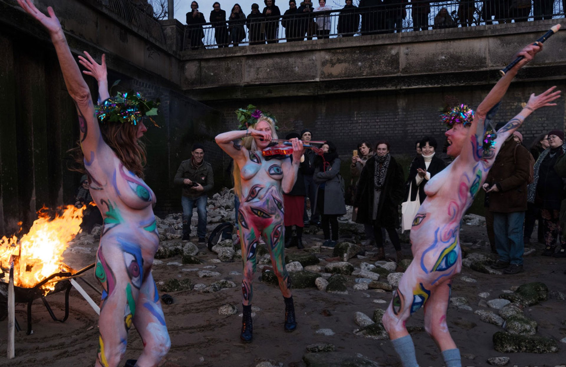 The fact that that Bean’s “pocket of resistance” also lies outside the jurisdiction of Canary Wharf and the Port of London authority was put to the test back at the winter solstice launch in December when neither the river police nor private security guards could intervene to prevent an inaugural performance involving three body-painted Neo Naturists and a yuletide fire inside a metal wheelbarrow.
