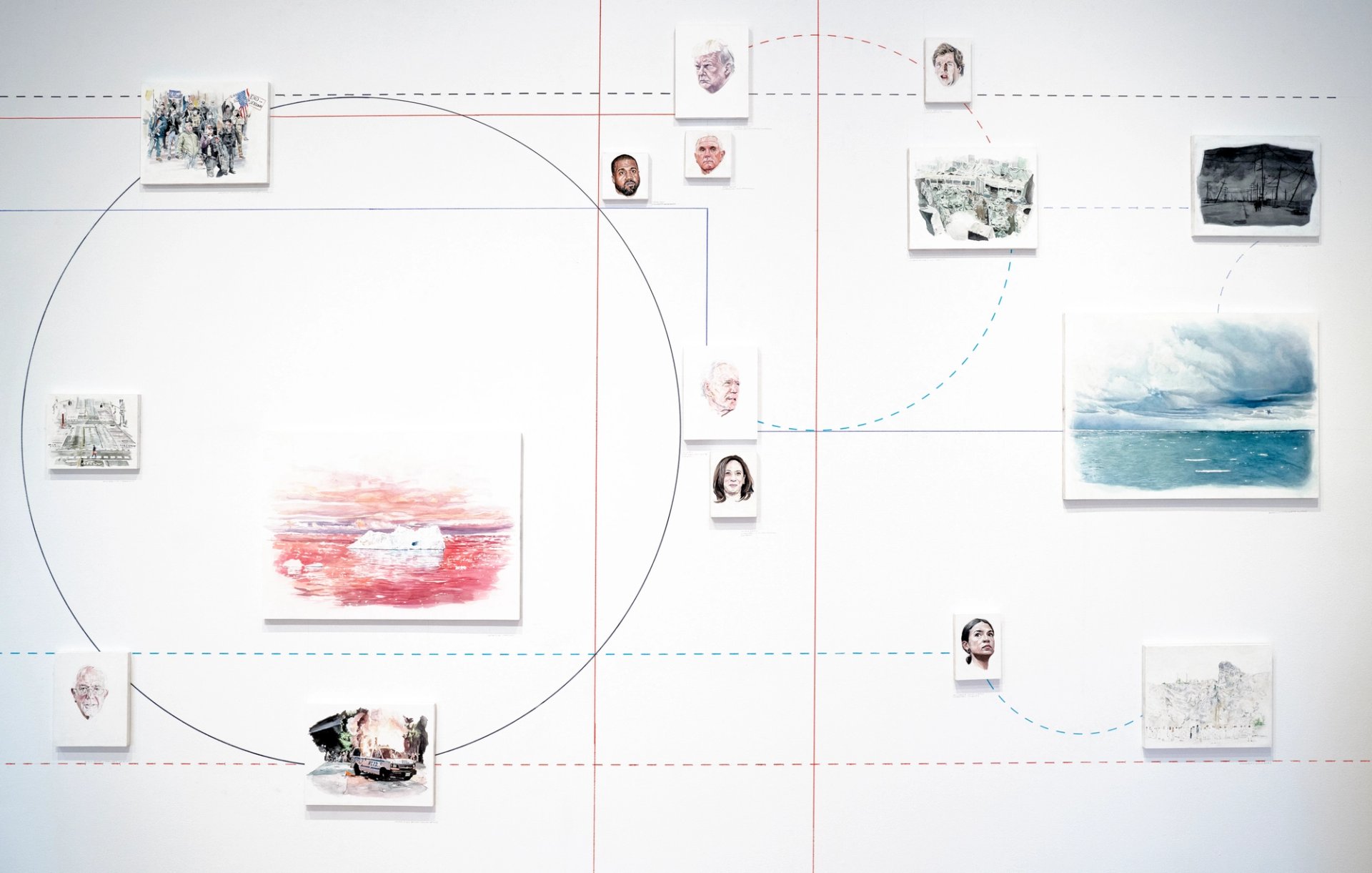 The artist William Powhida shared an image of his installation Possibilities for Representation, currently on view at the Aldrich Contemporary Art Museum in Ridgefield, Connecticut, saying: "When I began working on this installation in January, I knew I wanted to create a visual representation of how long the primary and election would feel relative to the long history that produced the candidates. In the installation's timeline, centuries occupy the same amount of time as decades, then years, then months, and then election day. I am deeply relieved that my decision to give Joe Biden and Kamala Harris a very subtle edge in the seemingly glacial presidential race was proven correct by some 74 million voters.”