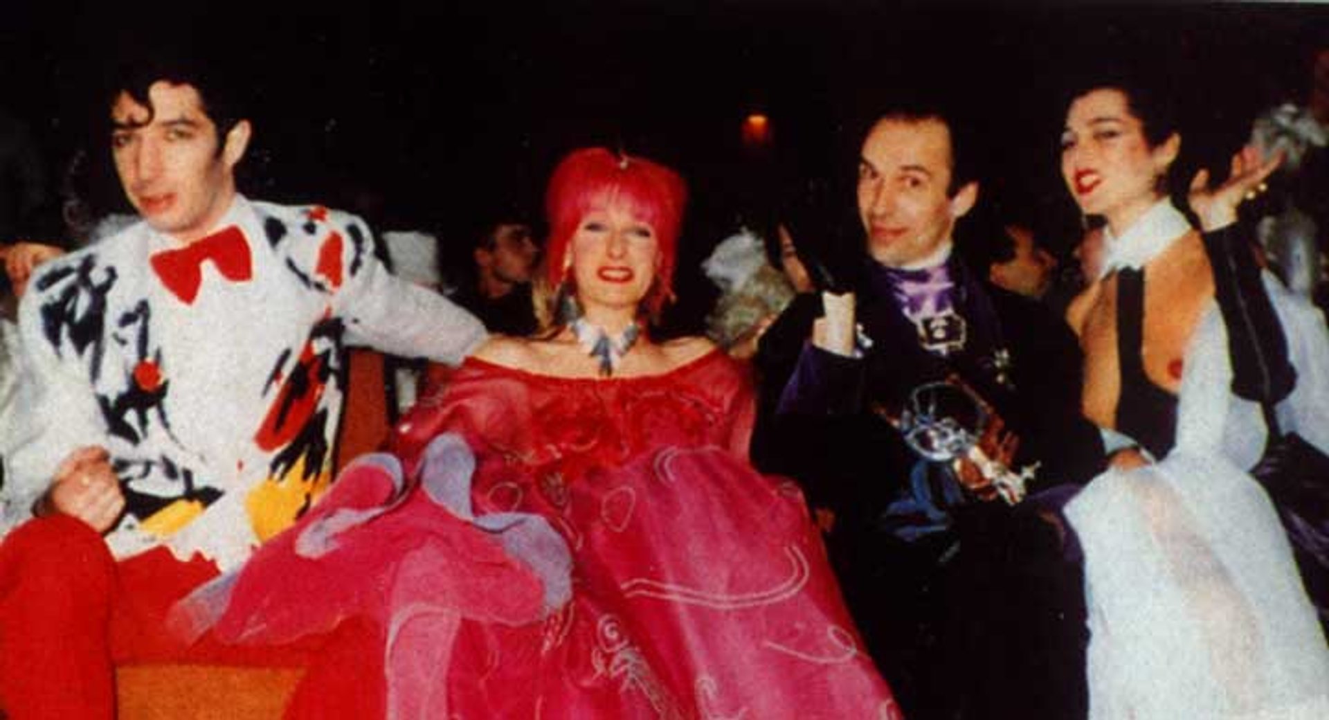 Duggie Fields with Zandra Rhodes, Andrew Logan & Luciana, at the Alternative Miss World film premiere, Vogue April 1990 © Duggie Fields
