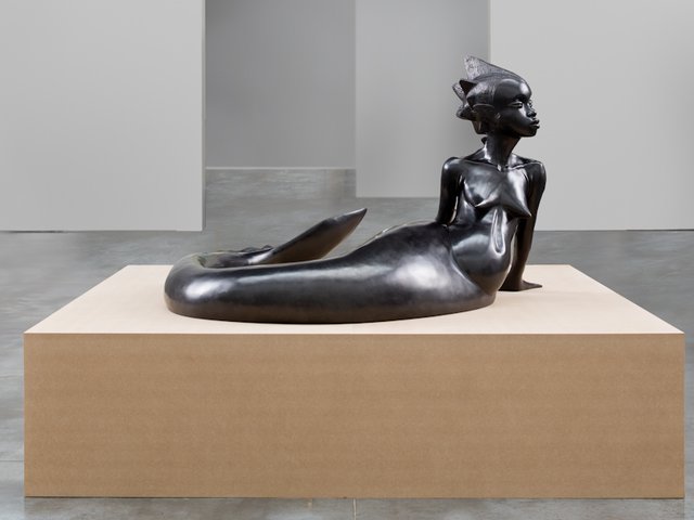 Mutu’s work immediately confronts visitors upon their arrival, smashing the sanitised, stately feel of the museum’s neoclassical building. As if walking into a crime scene, the first thing they will see are the splayed-out female figures, Savasana I and Savasana II (sanskrit for “corpse pose”; 2019), lying at the feet of Rodin’s The Thinker, mats covering their torsos and faces, and colourful high-heeled shoes falling off their feet. Visitors therefore cannot step into the colonnaded courtyard without thinking about violence, particularly against Black people. Further along, two fantastical bronzes (Mama Ray, 2020; Crocoydlus, 2020), which face the museum, do not so much greet visitors as appear ready to charge the institution.