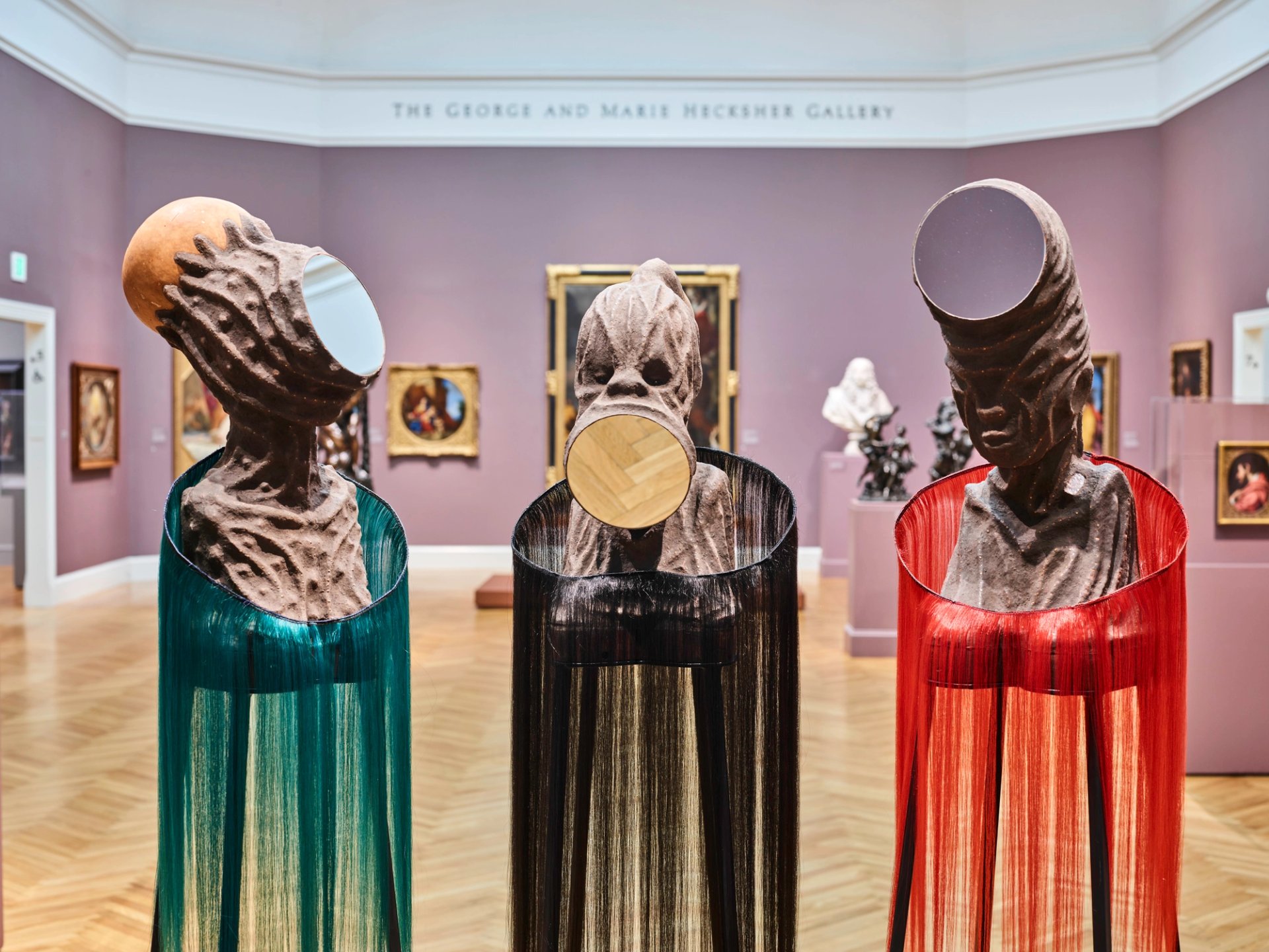 Mirror Faced I, Mirror Faced II, and Mirror Faced III (all 2020) from Wangechi Mutu: I Am Speaking, Can You Hear Me? at the Legion of Honor, San Francisco Photo: Randy Dodson, courtesy of the Fine Arts Museums of San Francisco, © Wangechi Mutu. All rights reserved. Courtesy the Artist and Gladstone Gallery, New York and Brussels"