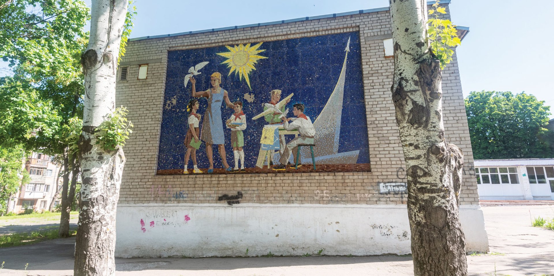 The two other surviving mosaics in Mariupol executed primarily by Arnautoff are Teacher with a Group of Children (1965), mounted on the exterior of a school, with the students depicted wearing Soviet-era red scarves, and From the Scythians to the Cosmos (1968-70), a visual history of the Azov region created for the city’s airport, with 78 figures on 26 themes. The latter also includes Soviet symbols and is well preserved, although the airport has been off limits to the public since being requisitioned by the Ukrainian military in 2014, says Zhenya Molyar, who was a curator at the Izolyatsia Foundation’s Soviet Mosaics in Ukraine project. That initiative relies on contributions from activists in Ukraine, often young people who have become vocal about the significance of art created in the Soviet era, says Molyar, who continues to study and promote the mosaics.