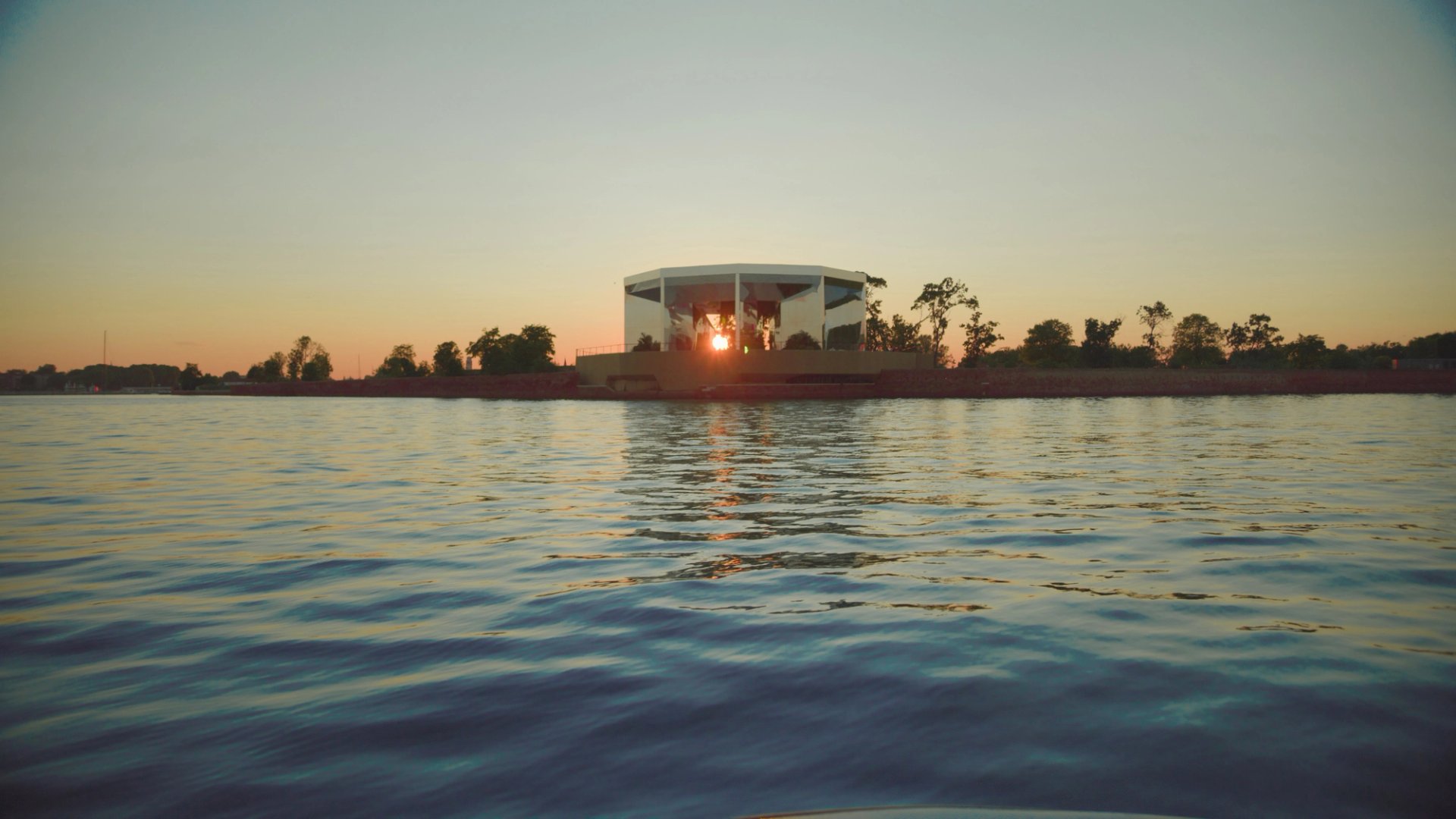 This became very compelling in creating the installation on the island, in a location that is over the water and looking towards the land and the forest. And I wanted this idea of a place that is asking questions about the future and provoking a discussion: where do we go from here? We have gone through this incredible arc of Covid: of questioning, international upheaval and disruption. But how do we turn this into a positive? How do we turn this period, this passage that we have experienced, into ownership of the future? I don't think we really had that in the past. We were just going down the river with too few questions and too much blindness. So really, to me, it is kind of a pavilion of the present. It is a space that you go to and that you engage with. When you see it, it is circular, like a glass. It has multiple sides and everything is geometrically equal. There is no hierarchy. There is no special part. There is no exclusivity. Everything is kind of democratised.