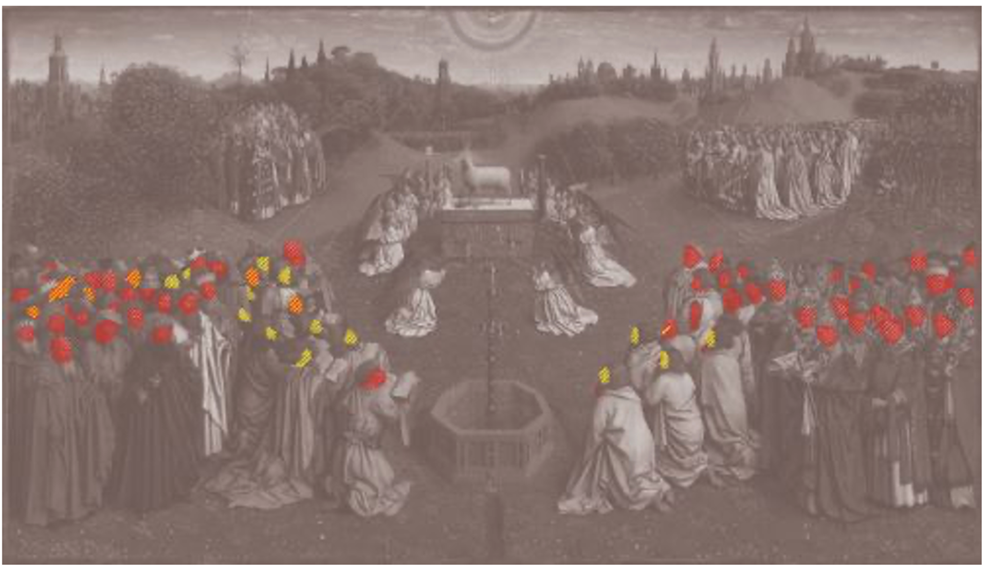 Adoration of the Lamb: heads attributed to Hubert van Eyck (in yellow), to Jan van Eyck (in red) and heads attributed to Hubert and reworked by Jan (in yellow and red) © Sint-Baafskathedraal Gent, www.artinflanders.be, foto KIK-IRPA