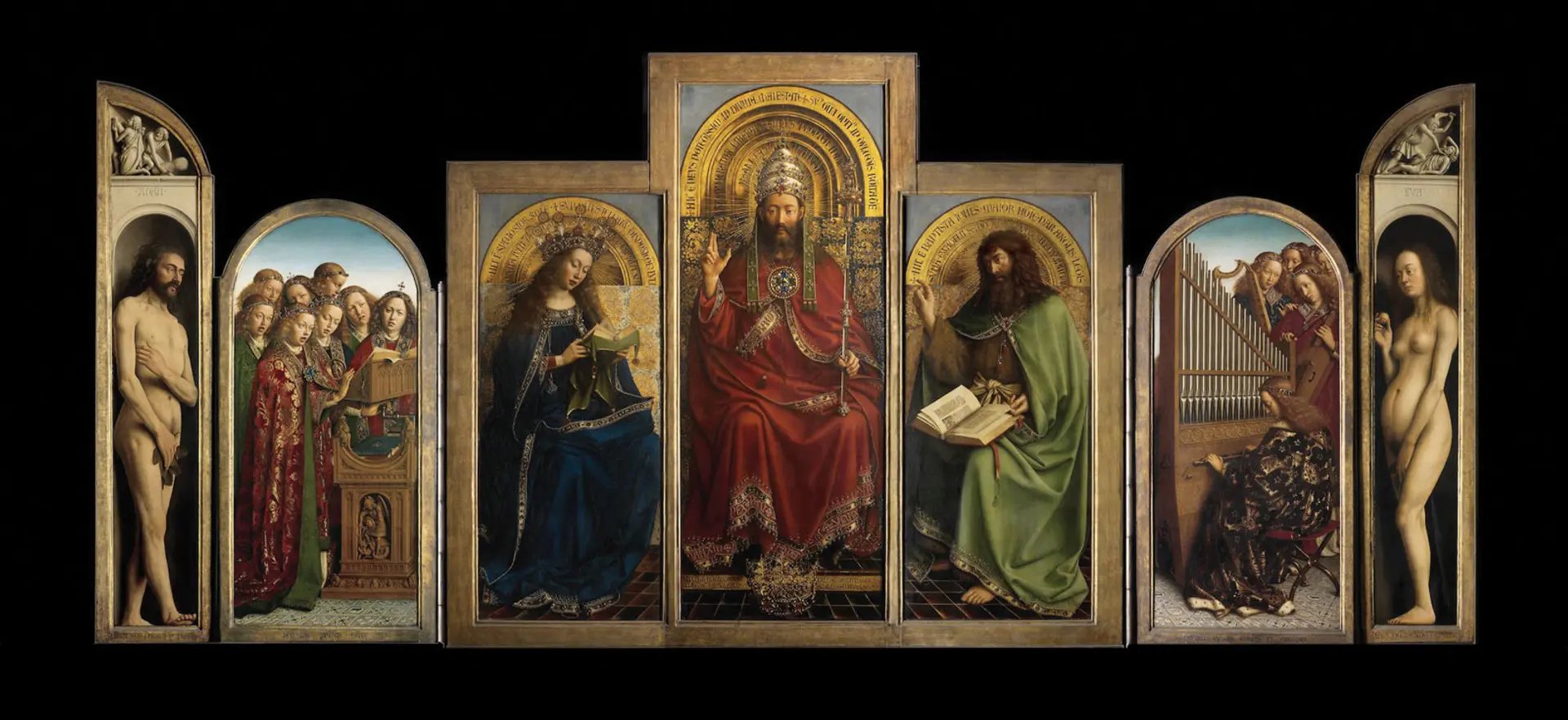 In 1823, a Latin quatrain was found under overpaint on the frame. It read: “The painter Hubert van Eyck, a greater man was never found, started this work. His brother Jan, second in art, completed this arduous task at the request of Joos Vijd. He invites you, on 6 May [1432], with this verse to behold what was done.”