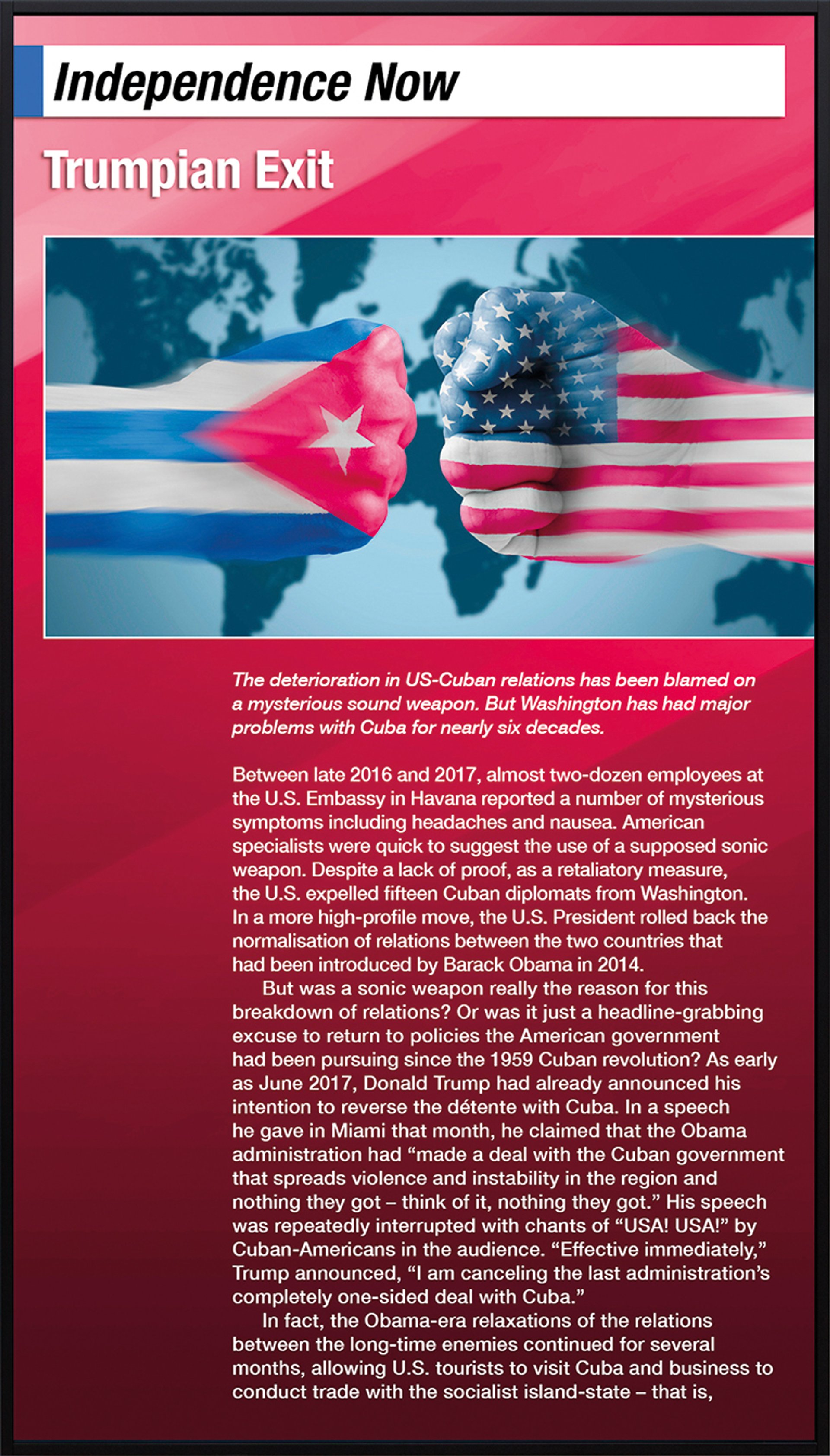 The first cases emerged when CIA agents staying at a Havana hotel reported hearing a piercing noise or a feeling of pressure in their heads followed by severe symptoms of nausea and vertigo and, later, persistent memory loss, dizziness and fatigue. Today, “attacks” on more than 200 US victims have been reported in countries from China and Vietnam to Germany and Serbia, and still no one knows the cause. (Theories include microwave devices and crickets native to Cuba.)