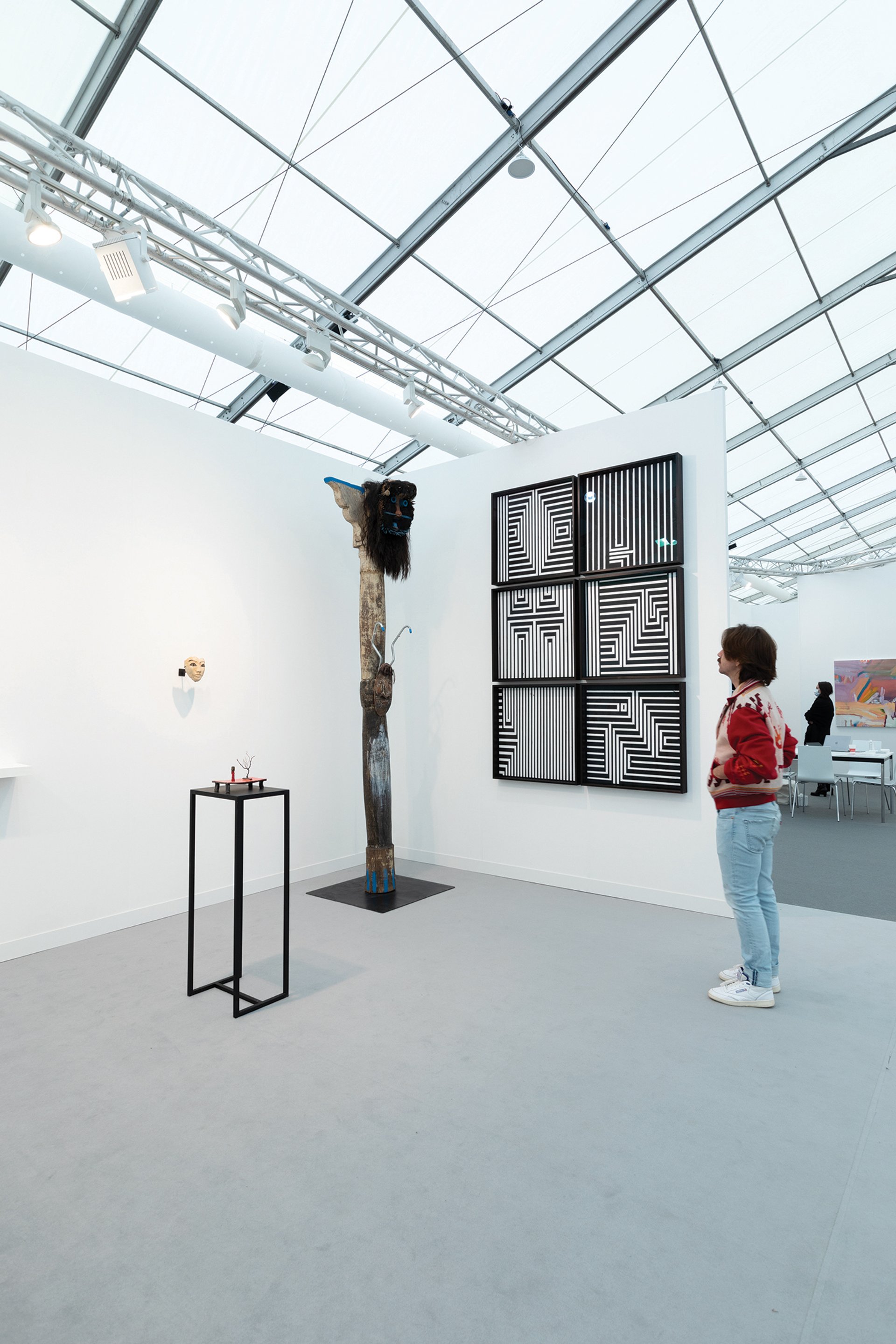 This stand brings together two artists investigating histories of colonialism and museum collections who are about to show their work in august European institutions: Baloji at the Uffizi in Florence and Cherri as artist-in-residence at the National Gallery in London. Baloji’s works in bronze and acrylic paint on paper investigate the global trade in textiles in the historic Kongo region, now part of the Democratic Republic of Congo, Angola and Gabon. They inevitably refer to another historic trade: slavery. Cherri’s vast totems and small figures bring together found and made objects to explore the distinctions in the classification between nature and culture, and the underlying social, historical and museological implications.