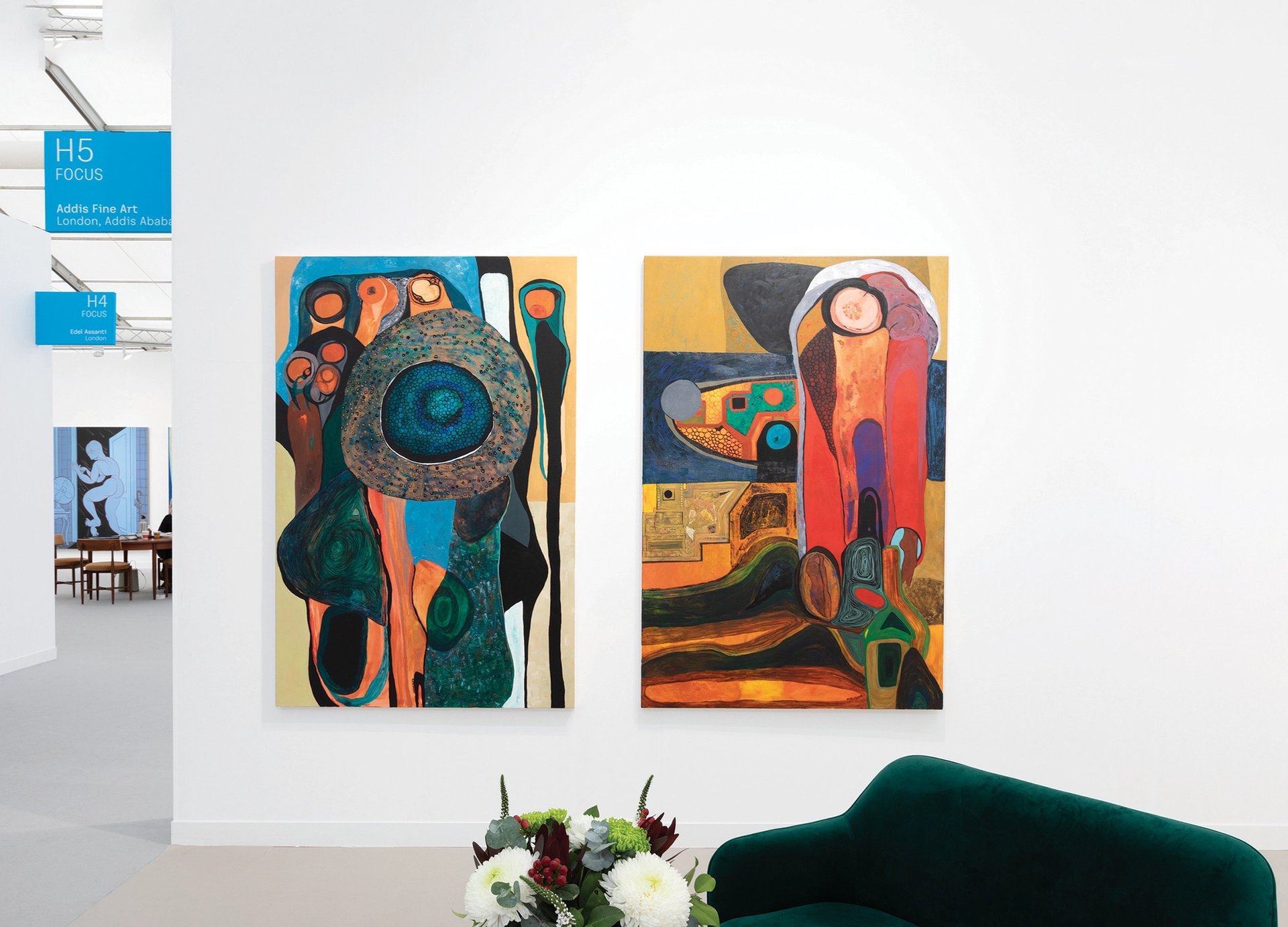 Berhanu’s paintings are difficult to pin down. Born in Addis Ababa in Ethiopia but now based in Maryland, she evokes the rupture of her emigration to the US in compositions that hint at figurative presences, still-lifes and landscapes but never resolve into a clear singular narrative. There is a sense of the micro meeting the macro, with cellular forms abutting those resembling geologic maps. Occasional clear references to bodies and animals—feet, cows and horses—are set amid abstract forms. It is this rich ambiguity, an enigmatic dreaminess, that makes Berhanu’s work so absorbing.