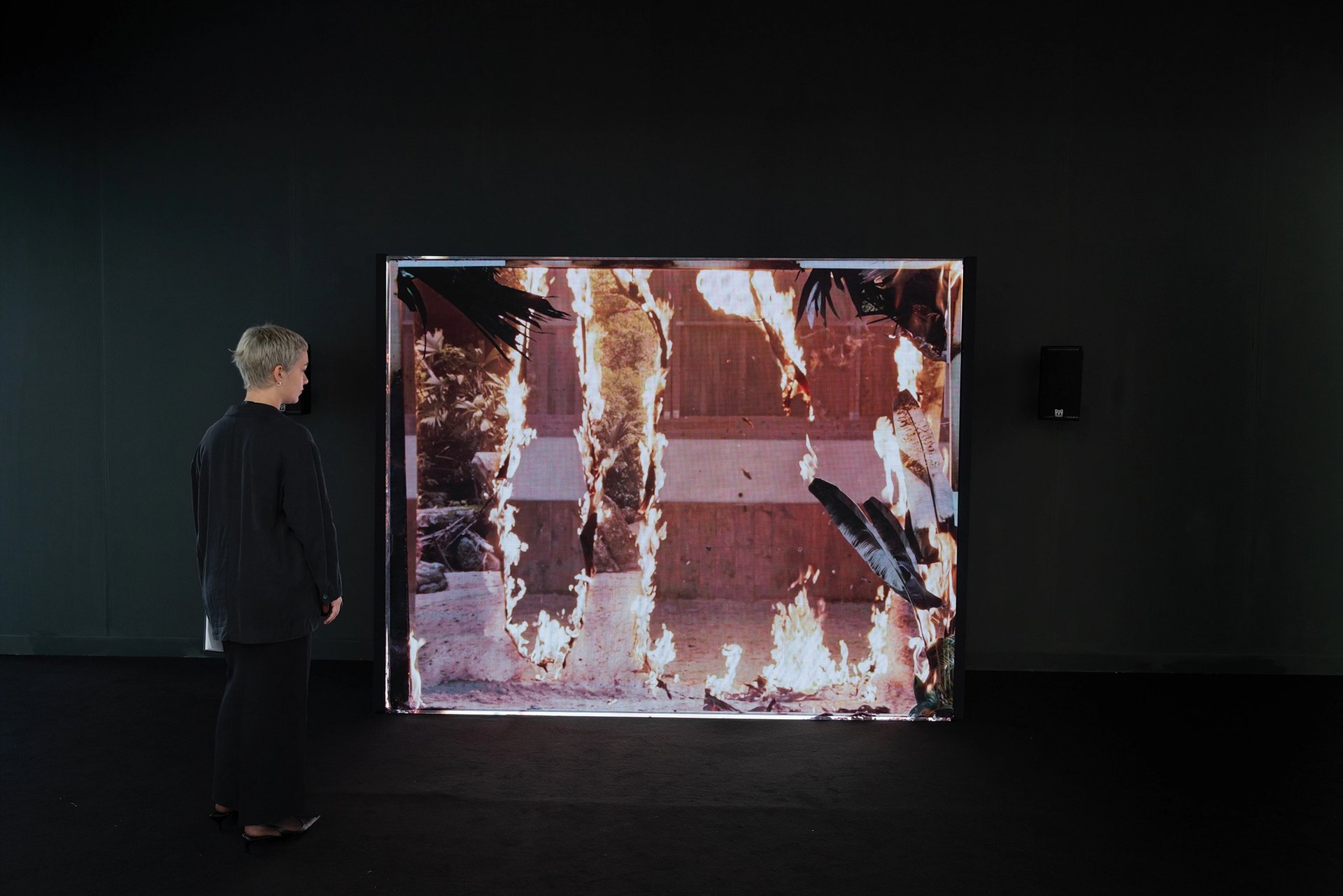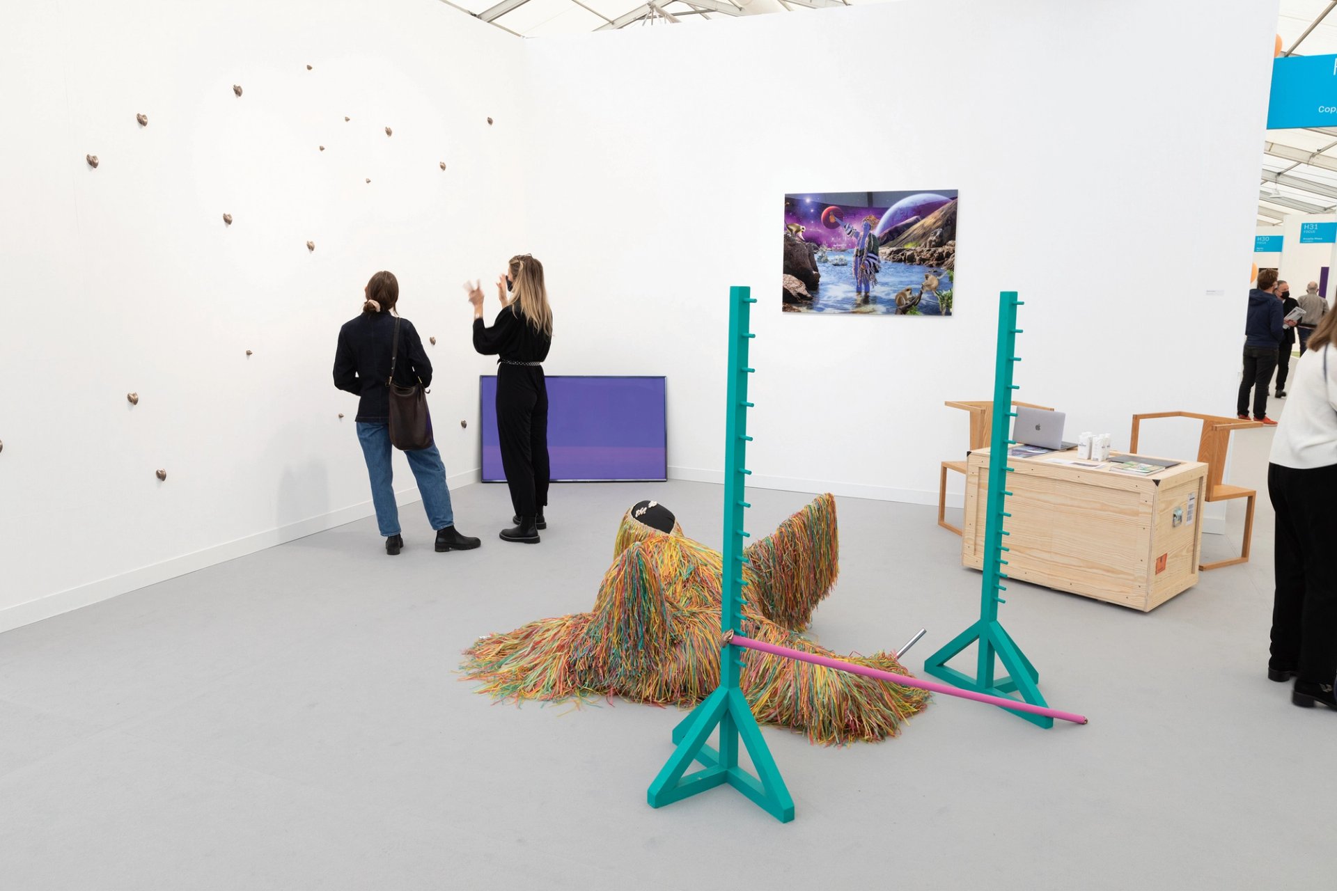 Calel’s work, The Echo of an Ancient Form of Knowledge (2021), has been acquired by the Tate galleries through the annual Frieze Tate Fund—or rather, Tate has become the piece’s custodian, since Calel sees these stones, and the fruits that sit on them, as altars and a “sacred site for rituals”. Calel, who is Guatemalan, explores the Indigenous experience through the beliefs and practices of his Mayan Kaqchikel heritage. What is likely to be viewed by most Frieze visitors as an installation is in fact an offering to his ancestors. Both in the Tate acquisition and the very act of displaying the piece at the fair, Calel challenges us to consider the complexities of Indigenous cultures and the ongoing effects of their destruction.