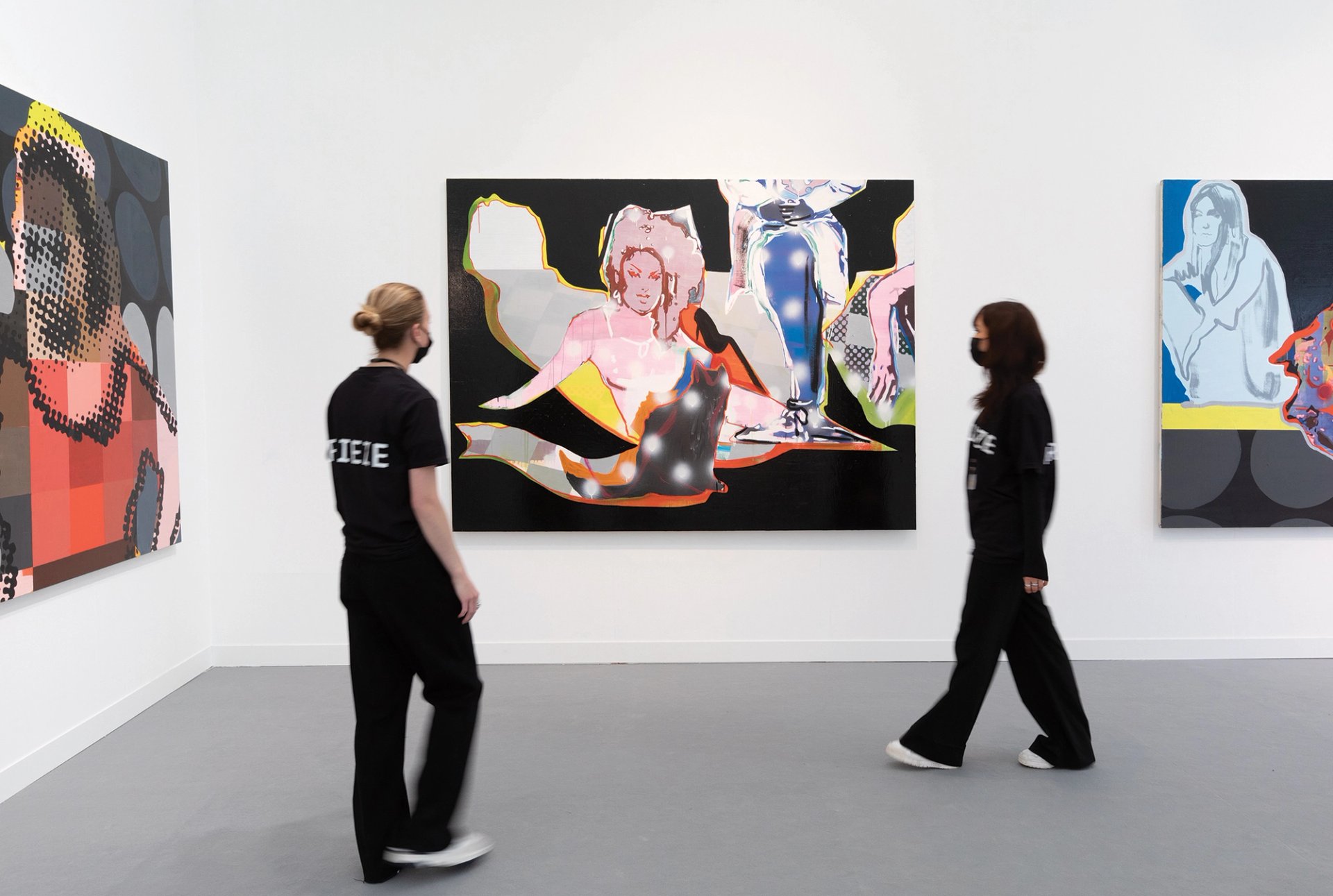 In her More Girlfriends paintings (all 2021), Fourchy takes images of notable performers, including Charlotte Gainsbourg, Isabelle Huppert, Divine and Anjelica Huston, and sets them within bold, patterned spaces. Fourchy, who is based in New York, was taught by the American artist Wayne Thiebaud and her paintings surf the outskirts of Pop as well as nodding to Sigmar Polke, Henri Matisse and others. The collage-like feel of the paintings is enhanced by Fourchy’s use of oil and enamel paint, lending a distinctive texture and sheen to areas within the composition, where Fourchy’s protagonists loom into focus or are abstracted almost to illegibility.