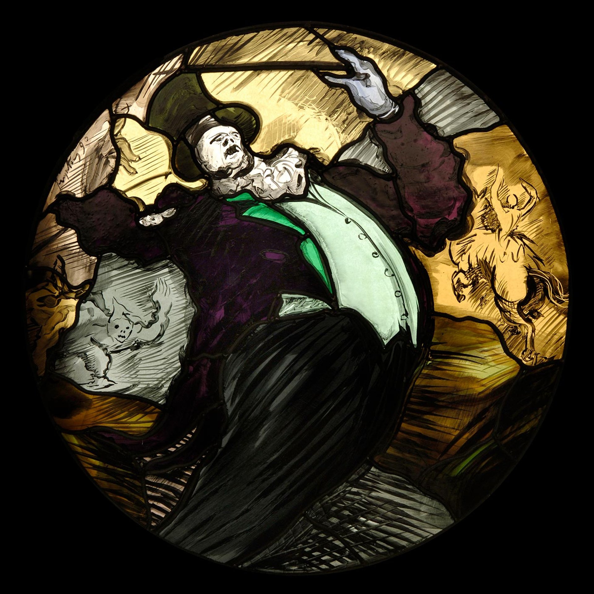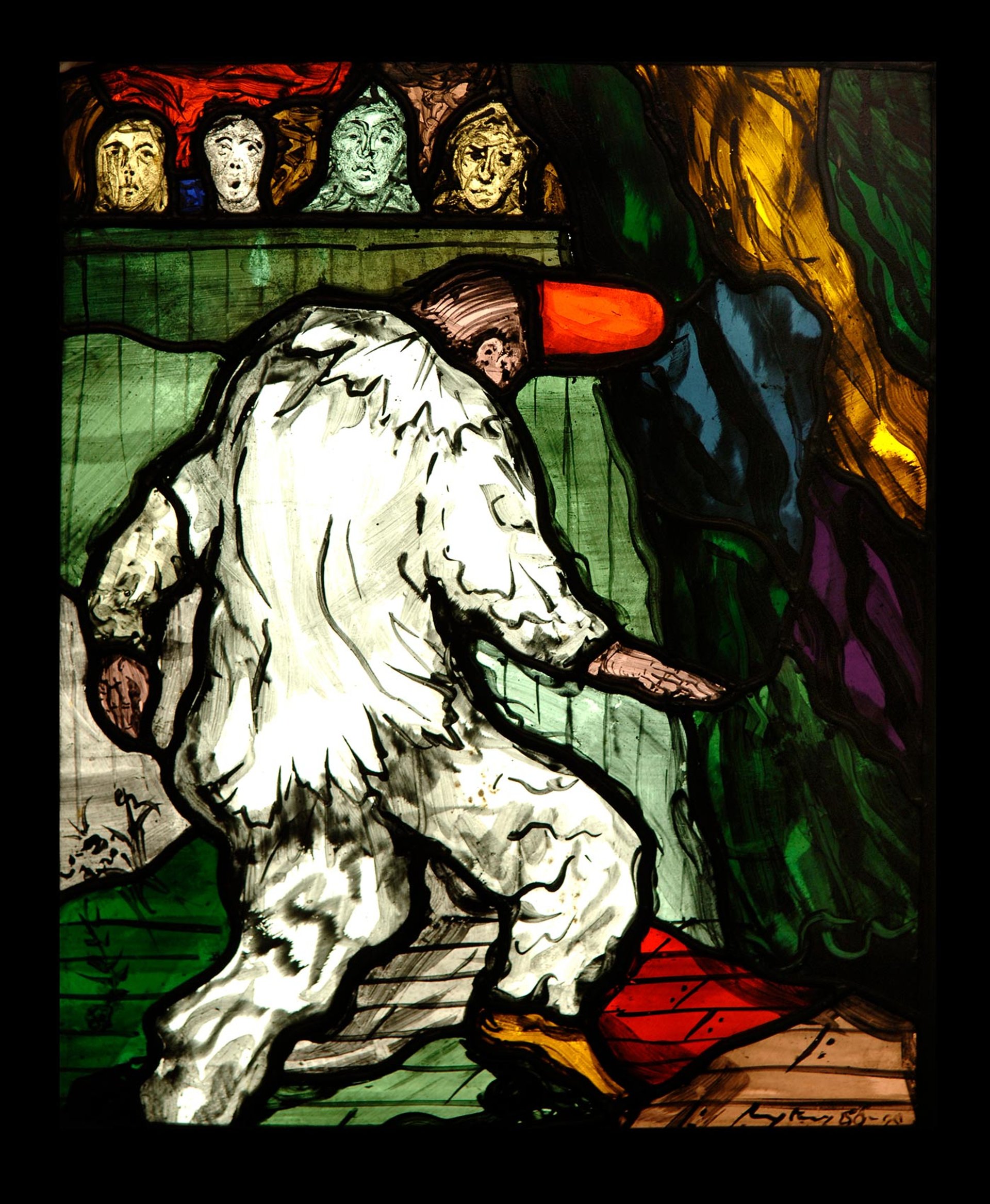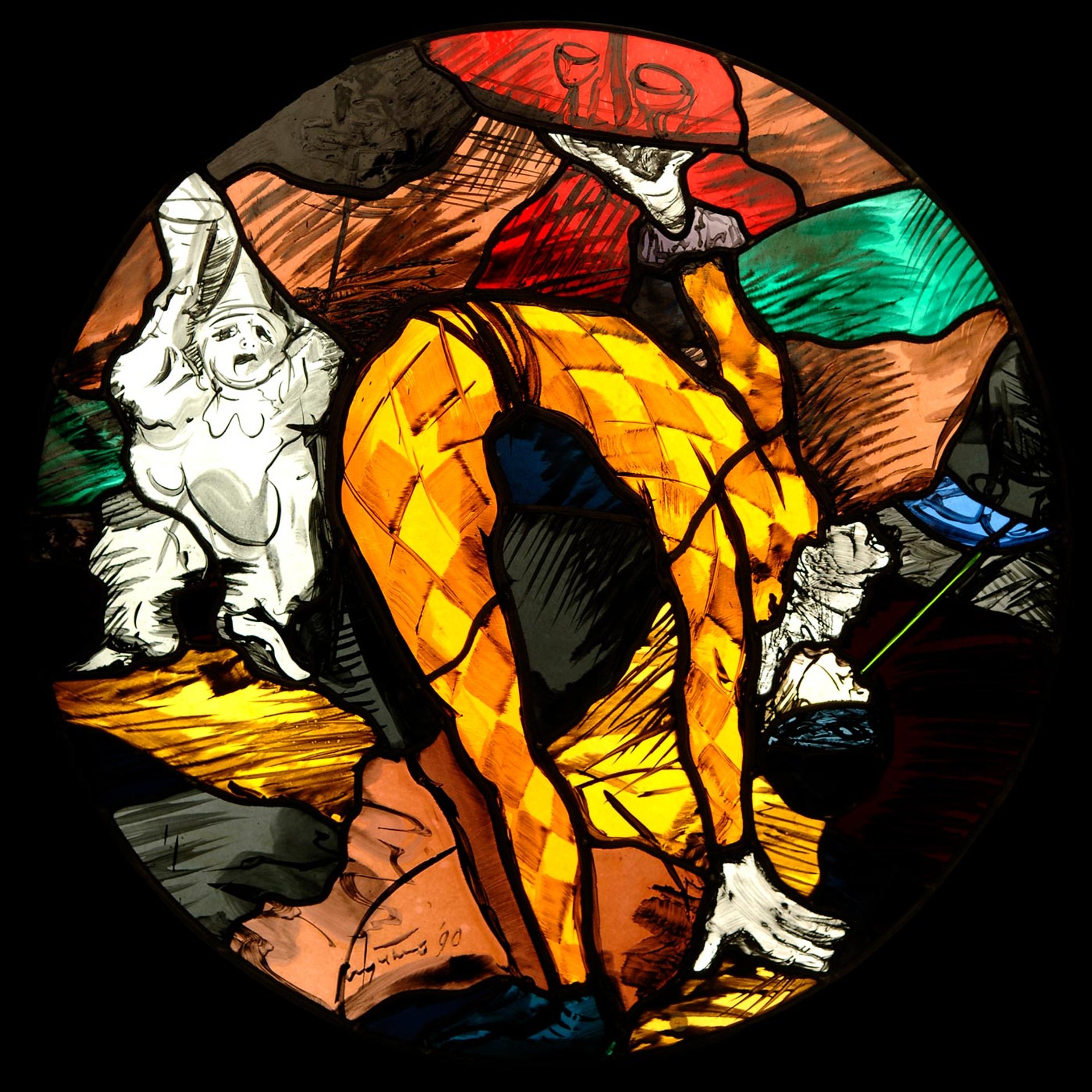 With retirement from Central in 1986, Reyntiens focused anew on autonomous panels, “emancipated from the thrall of modern architecture”, drawing on his large stock of glass offcuts to make pieces that might be sold in galleries and editions. These panels—on the theatre, the Orpheus legend, and hommages to his favourite composers—have a remarkable fluency and painterly impact. The 1990 Circus panels have a haunting quality all of their own, bringing to glass the fluency of a Rowlandson ink caricature and the graphic energy of a William Nicholson lithograph.