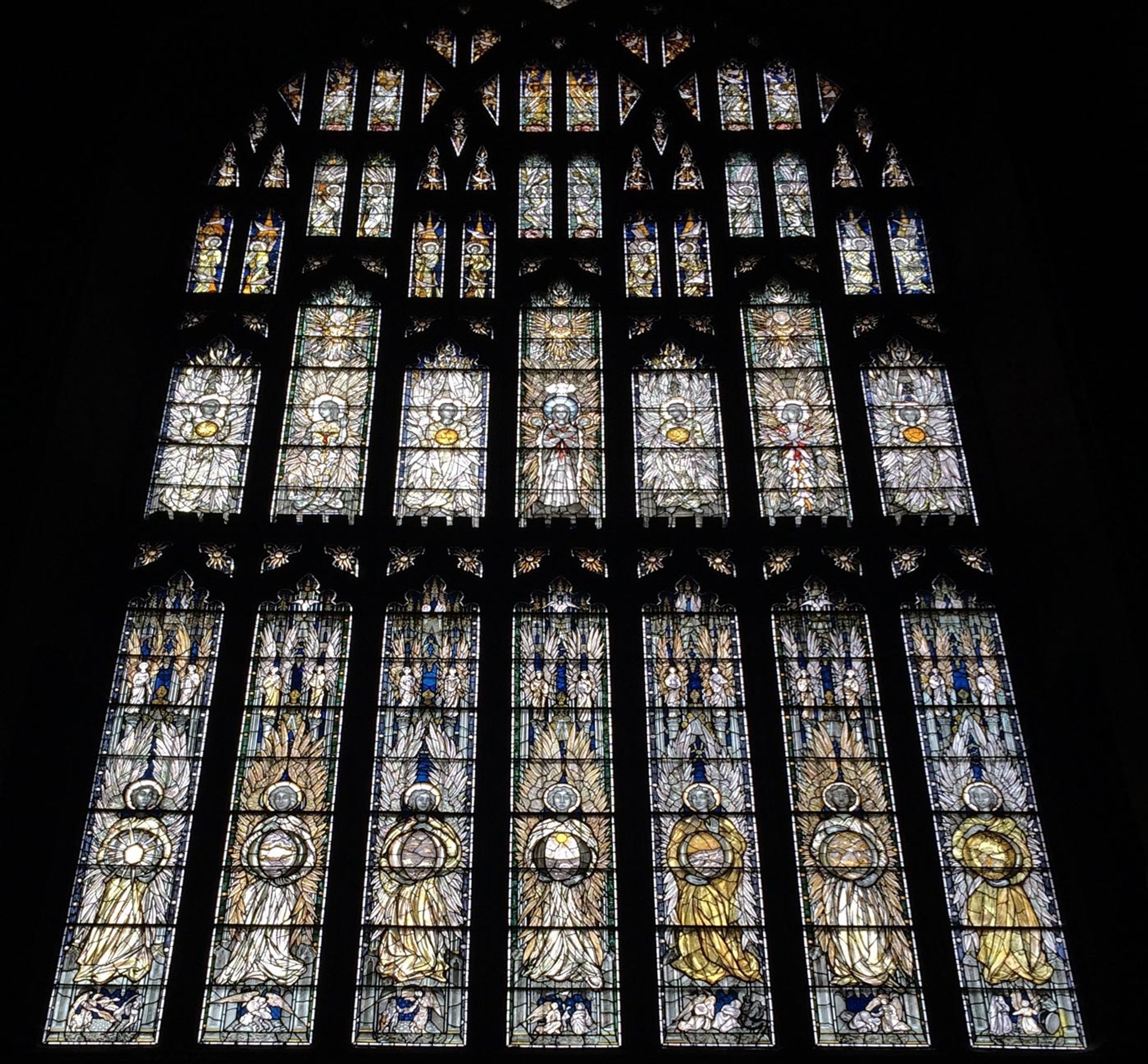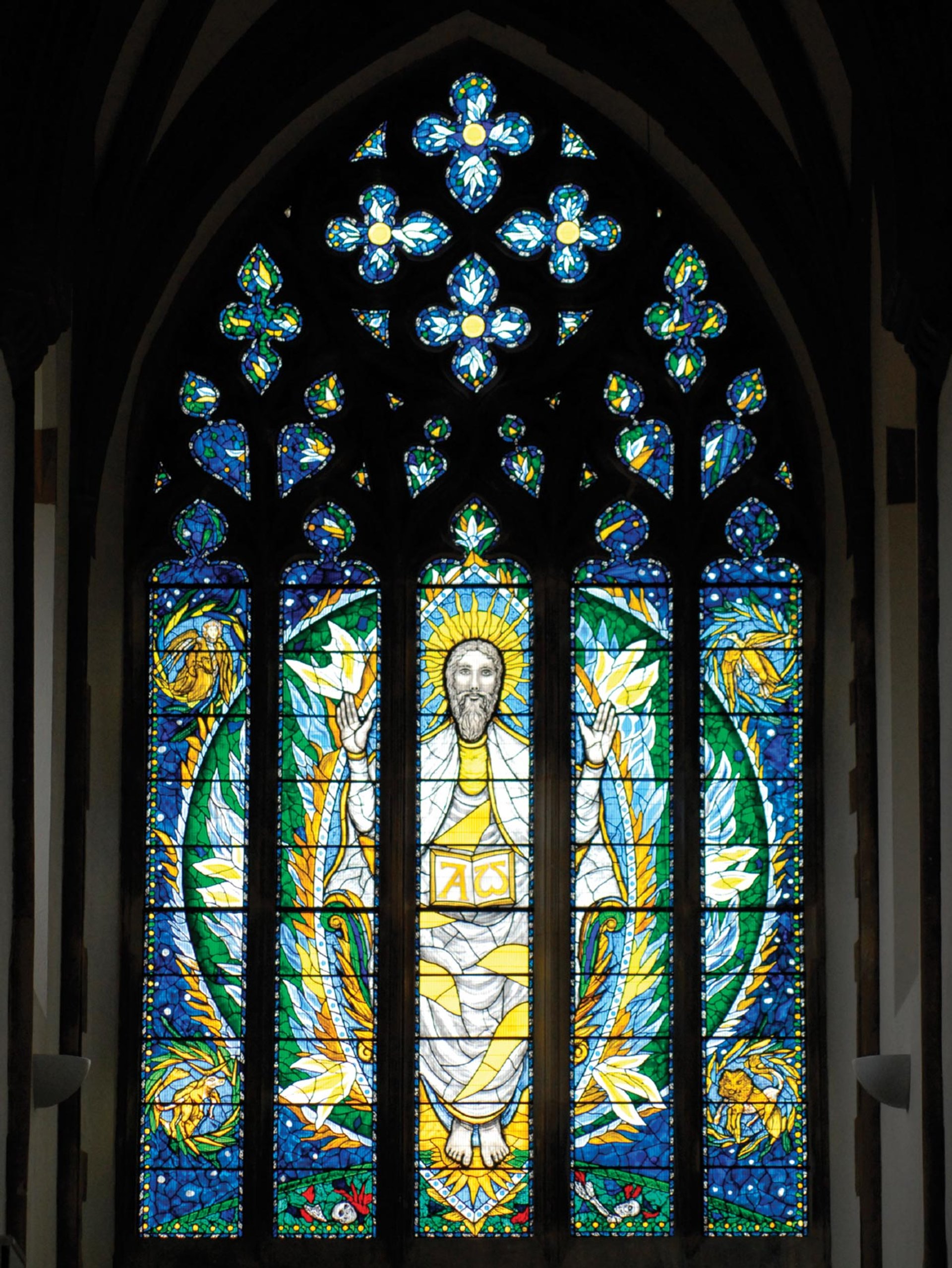 Reyntiens, then in his early 80s, collaborated on the design with a younger artist, the brilliant colourist Graham Jones, but painted all the glass himself—in socks, shorts and T-shirt—at the famous Derix studios in Taunusstein, near Wiesbaden, with leading lines so fine as to be almost invisible. “The beauty is the figures don’t match the colour, that’s where the mysticism is,” Jones remarked after the dedication.