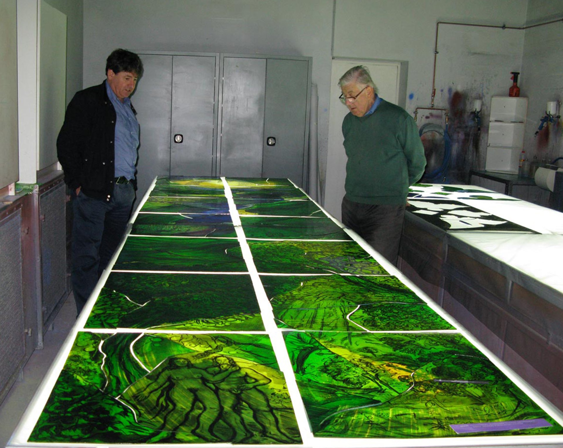 Graham Jones and Patrick Reyntiens contemplate Prehistory, one of the eight windows they designed for St Martin's, Cochem, Germany, 2004-09 Courtesy of John Reyntiens