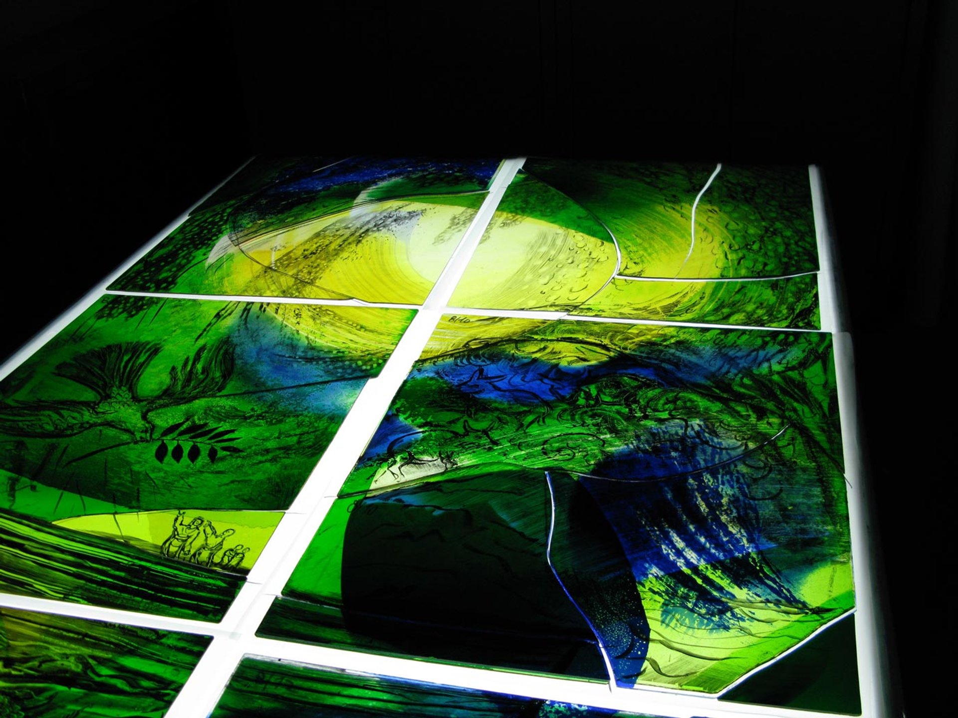 Pieces of painted glass assembled on glassbox for one of eight windows (each 12.19m tall) at St Martin, Cochem, Germany, 2009. Designed by Patrick Reyntiens and Graham Jones, painted by Reyntiens, with the glass made by Derix Studios, Taunusstein Courtesy of Reyntiens Trust