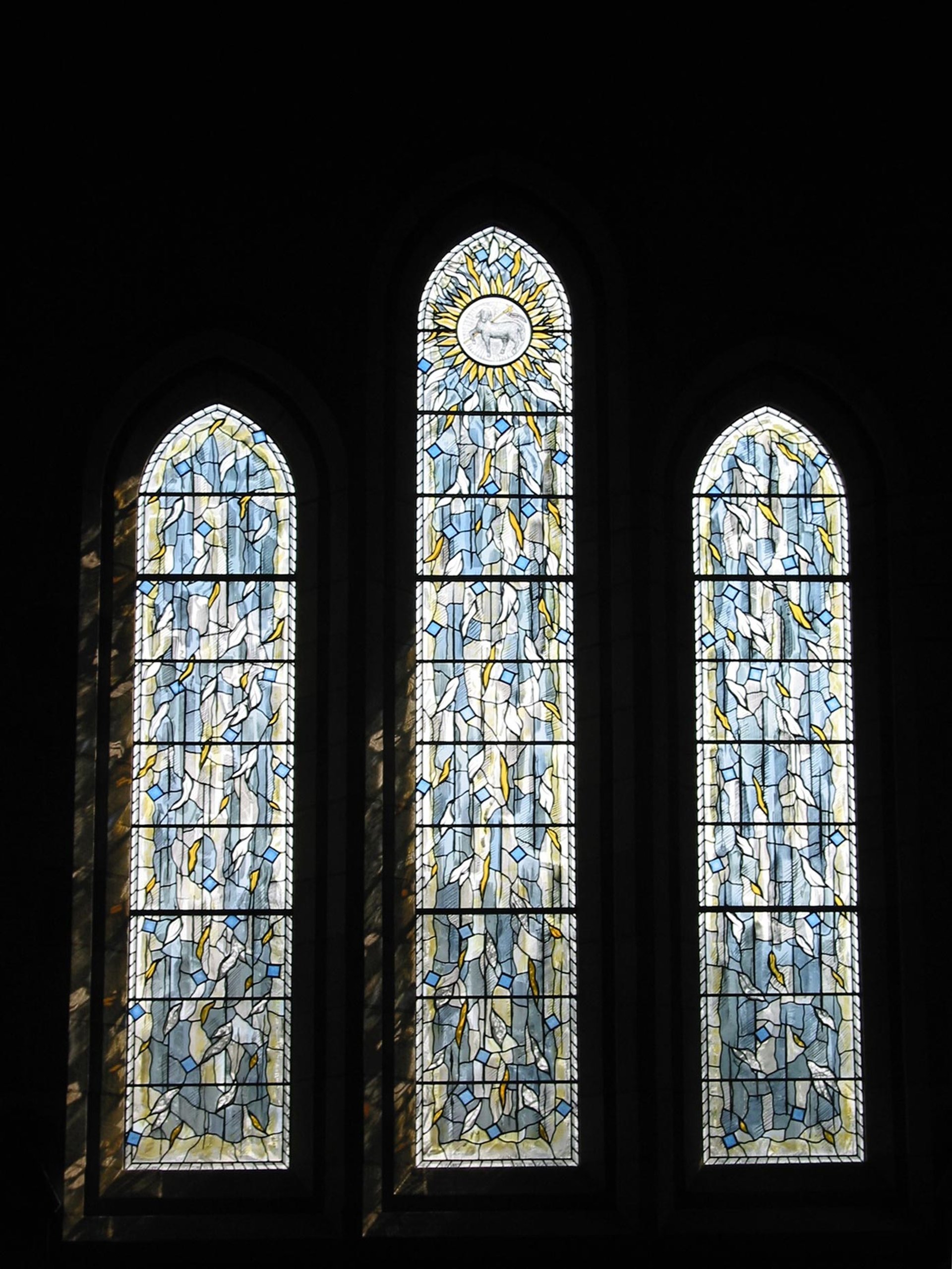 He made a window of the Annunciation for the abbey church at his old school, Ampleforth, in 1961. “I thought the Annunciation was supposed to be good news!” remarked the abbot, Herbert Byrne, regarding the figure of Our Lady—modelled on Anne Bruce and described by Nikolaus Pevsner as “Expressionistic”. Reyntiens created some of his most successful abstract designs in floor-to-ceiling panels for two large new Catholic churches in Co Waterford, Ireland, in the late 1960s.