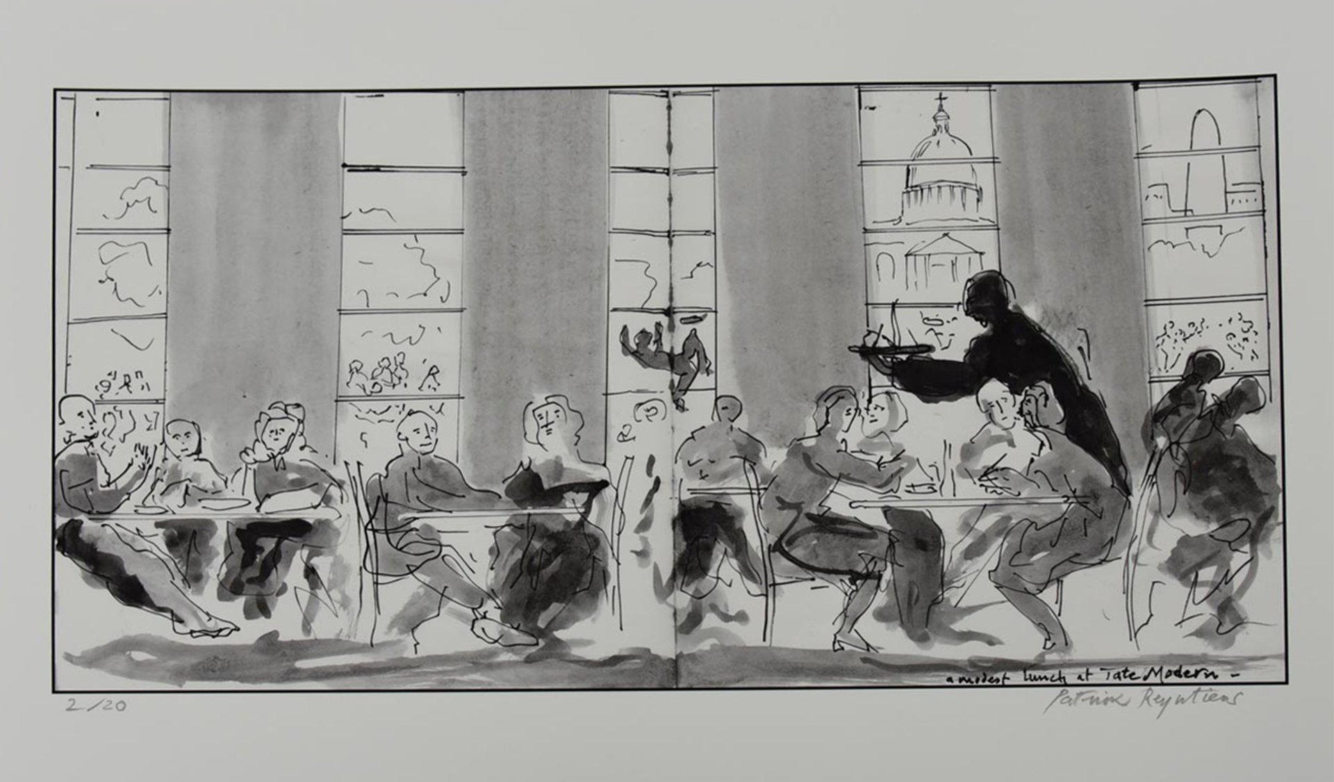 Patrick Reyntiens, A Modest Lunch at Tate Modern, print from a sketchbook of early 2000s Courtesy of Reyntiens Trust